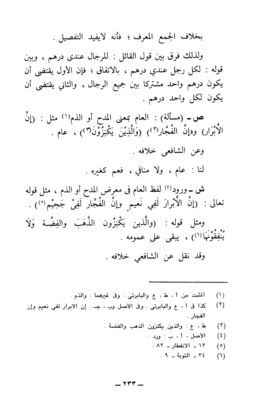 ش - وُرُودُ لَفْظِ الْعَامِّ فِي مَعْرِضِ الْمَدْحِ أَوِ الذَّمِّ، مِثْلَ قَوْلِهِ تَعَالَى: {إِنَّ الْأَبْرَارَ لَفِي نَعِيمٍ وَإِنَّ الْفُجَّارَ لَفِي جَحِيمٍ} [الانفطار: ١٣] . وَمِثْلَ قَوْلِهِ: {وَالَّذِينَ يَكْنِزُونَ الذَّهَبَ وَالْفِضَّةَ وَلَا يُنْفِقُونَهَا} [التوبة: ٣٤] ، يَبْقَى عَلَى عُمُومِهِ.