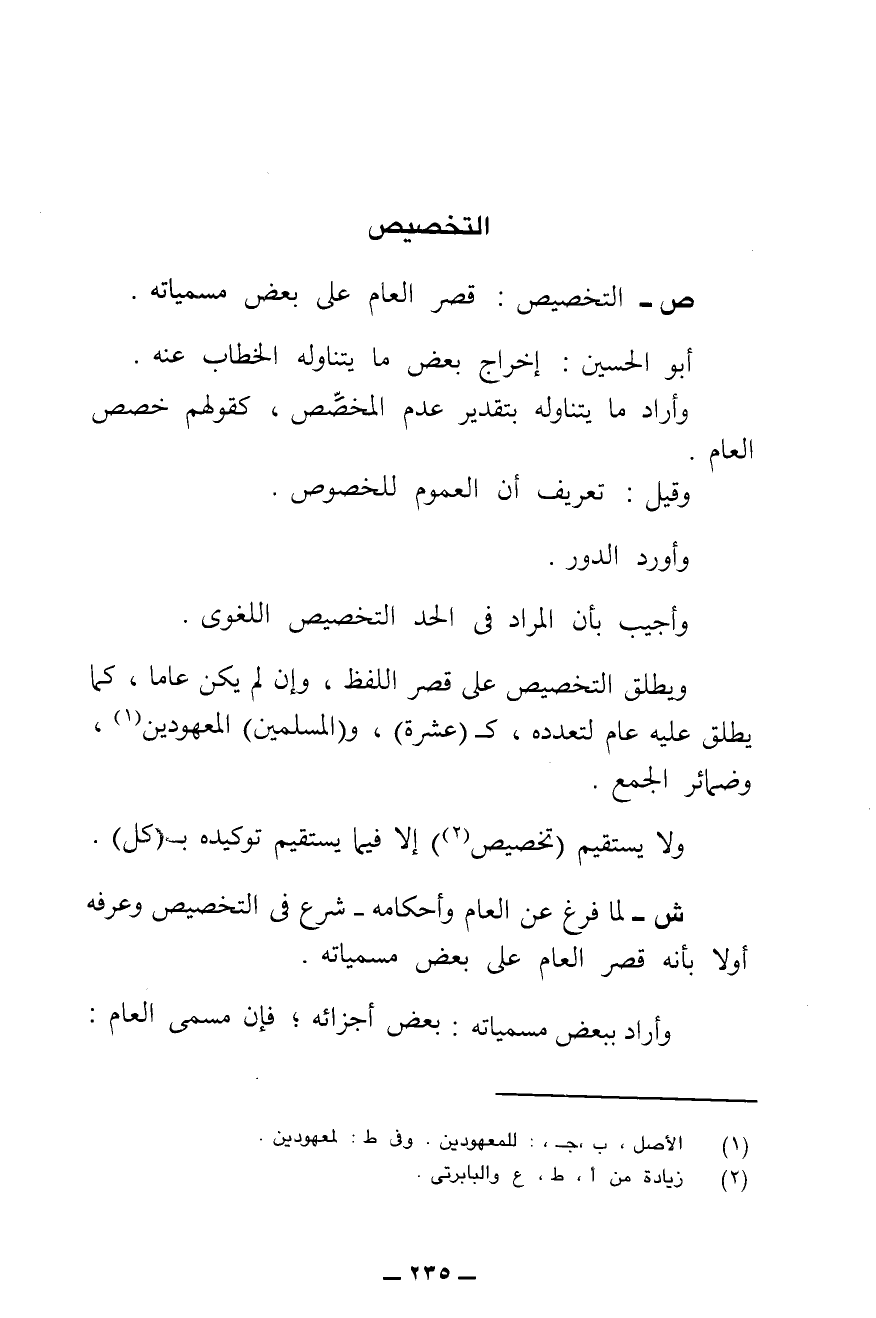 ص - التَّخْصِيصُ: قَصْرُ الْعَامِّ عَلَى بَعْضِ مُسَمَّيَاتِهِ.
