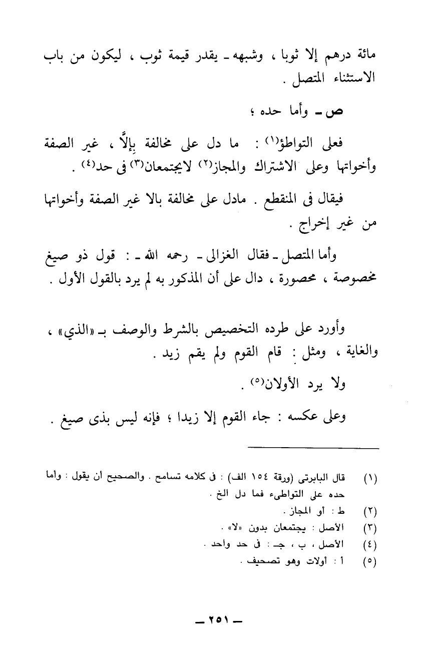 ش - حَدُّ الِاسْتِثْنَاءِ - بِنَاءً عَلَى الْقَوْلِ بِكَوْنِهِ مُتَوَاطِئًا -: مَا دَلَّ عَلَى مُخَالَفَةٍ بِإِلَّا غَيْرَ الصِّفَةِ وَأَخَوَاتِهَا. نَحْوَ: لَيْسَ، وَلَا يَكُونُ، وَعَدَا، وَخَلَا، وَمَا خَلَا، وَمَا عَدَا، وَحَاشَا، وَسِوَى، وَغَيْرَ.