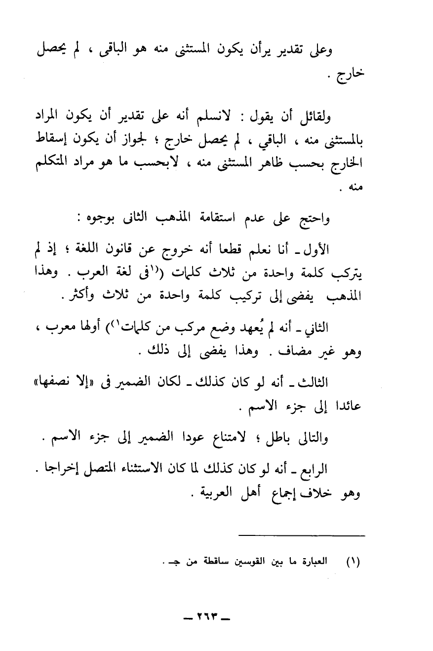 ش - الْقَائِلُونَ بِالْمَذْهَبِ الْأَوَّلِ احْتَجُّوا بِوَجْهَيْنِ: الْأَوَّلُ - أَنَّهُ لَوْ قَالَ: لَهُ عَلَيَّ عَشَرَةٌ إِلَّا ثَلَاثَةً لَمْ يَسْتَقِمْ أَنْ يُرَادَ بِعَشَرَةٍ: عَشَرَةٌ بِكَمَالِهَا ; لِأَنَّا نَعْلَمُ قَطْعًا أَنَّهُ مَا أَقَرَّ إِلَّا بِسَبْعَةٍ. فَيَتَعَيَّنُ أَنْ يَكُونَ الْمُرَادُ بِعَشَرَةٍ: سَبْعَةً. وَهُوَ الْمَطْلُوبُ.