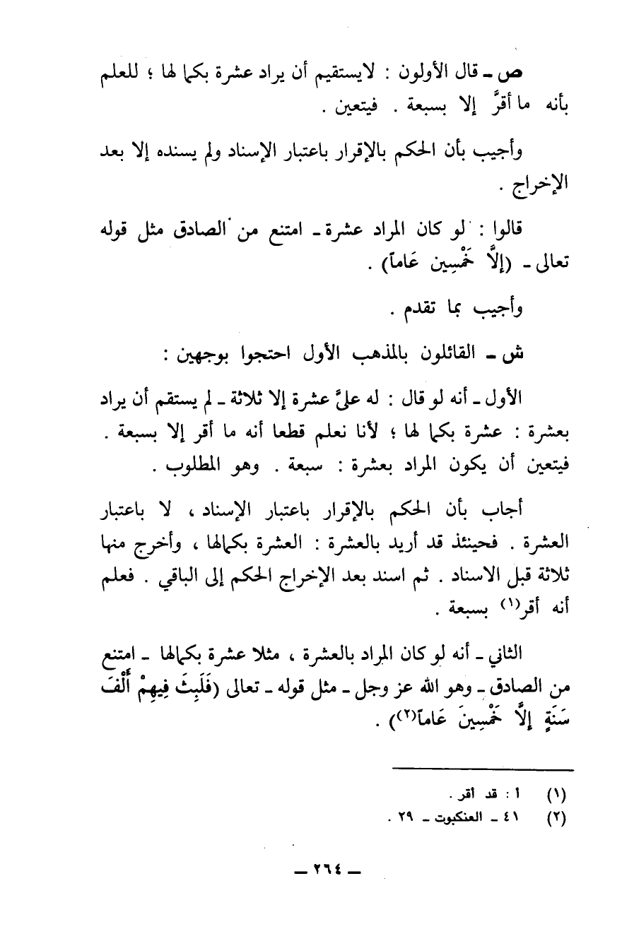 قَالُوا: لَوْ كَانَ الْمُرَادُ عَشَرَةً امْتَنَعَ مِنَ الصَّادِقِ مِثْلُ قَوْلِهِ تَعَالَى - {إِلَّا خَمْسِينَ عَامًا} [العنكبوت: ١٤] .
