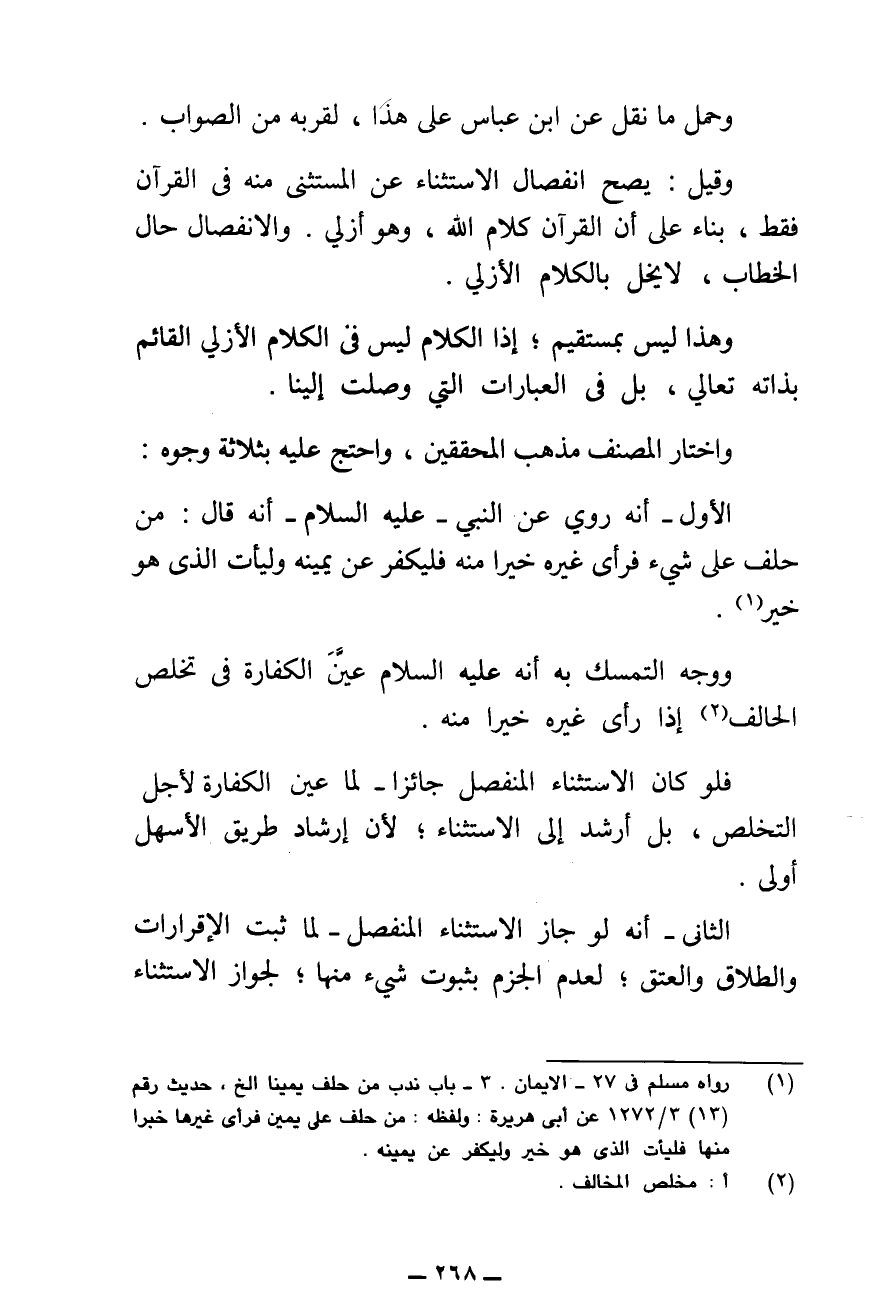 فَلَوْ كَانَ الِاسْتِثْنَاءُ الْمُنْفَصِلُ جَائِزًا - لَمَا عَيَّنَ الْكَفَّارَةَ لِأَجْلِ التَّخَلُّصِ، بَلْ أَرْشَدَ إِلَى الِاسْتِثْنَاءِ ; لِأَنَّ إِرْشَادَ طَرِيقِ الْأَسْهَلِ أَوْلَى.