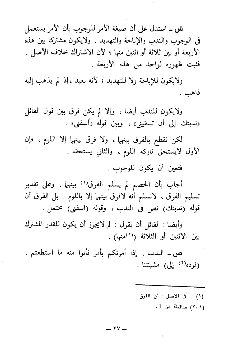 ش - اسْتَدَلَّ عَلَى أَنَّ صِيغَةَ الْأَمْرِ لِلْوُجُوبِ بِأَنَّ الْأَمْرَ يُسْتَعْمَلُ فِي الْوُجُوبِ وَالنَّدْبِ وَالْإِبَاحَةِ وَالتَّهْدِيدِ. وَلَا يَكُونُ مُشْتَرَكًا بَيْنَ هَذِهِ الْأَرْبَعَةِ أَوْ بَيْنَ ثَلَاثَةٍ أَوِ اثْنَيْنِ مِنْهَا ; لِأَنَّ الِاشْتِرَاكَ خِلَافُ الْأَصْلِ. فَثَبَتَ ظُهُورُهُ لِوَاحِدٍ مِنْ هَذِهِ الْأَرْبَعَةِ.