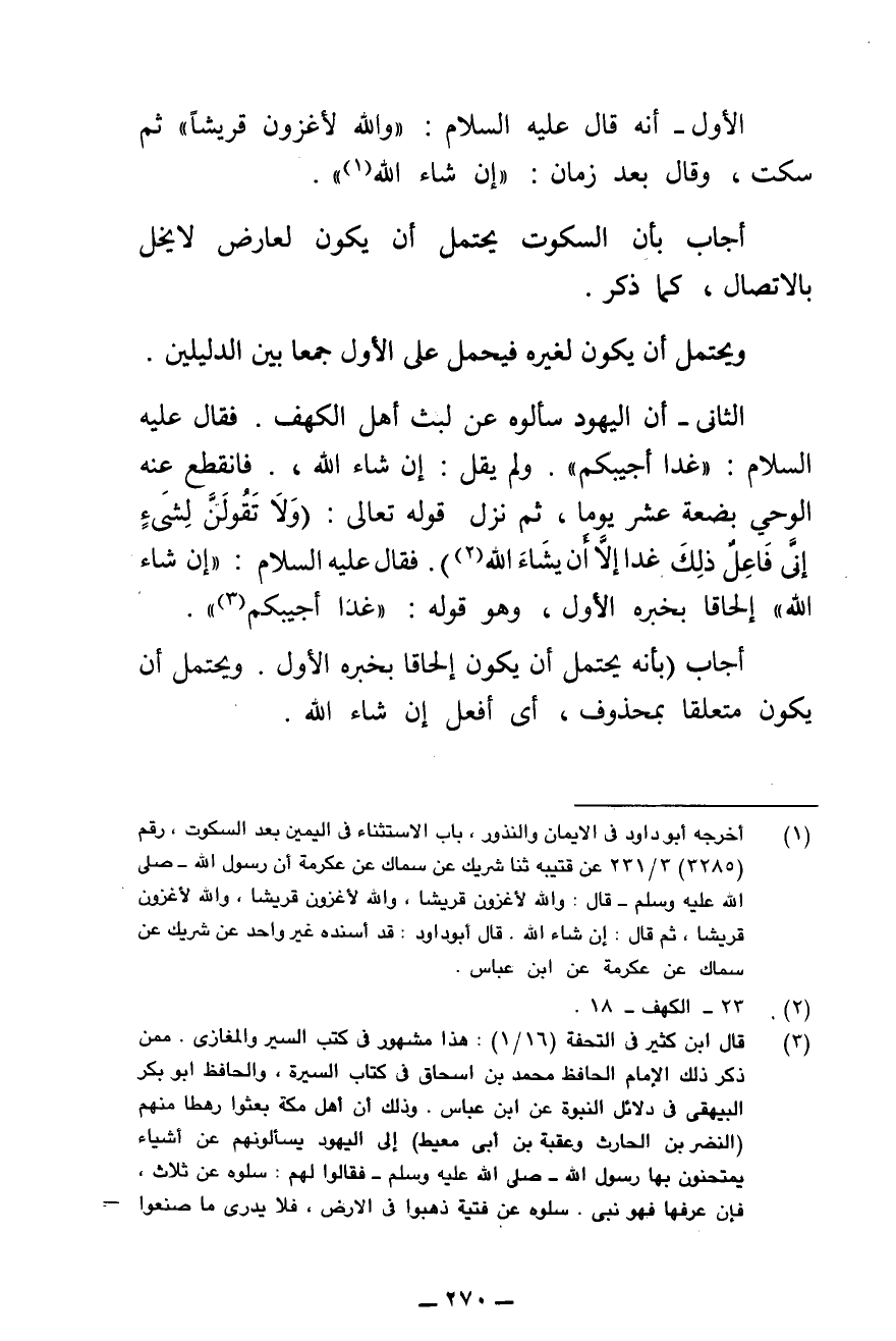 الثَّانِي - «أَنَّ الَيْهُودَ سَأَلُوهُ عَنْ لُبْثِ أَهْلِ الْكَهْفِ فَقَالَ عَلَيْهِ السَّلَامُ: " غَدًا أُجِيبُكُمْ " وَلَمْ يَقُلْ: إِنْ شَاءَ اللَّهُ، فَانْقَطَعَ عَنْهُ الْوَحْيُ بِضْعَةَ عَشَرَ يَوْمًا، ثُمَّ نَزَلَ قَوْلُهُ تَعَالَى: {وَلَا تَقُولَنَّ لِشَيْءٍ إِنِّي فَاعِلٌ ذَلِكَ غَدًا إِلَّا أَنْ يَشَاءَ اللَّهُ} [الكهف: ٢٣] فَقَالَ عَلَيْهِ السَّلَامُ ; " إِنْ شَاءَ اللَّهُ» إِلْحَاقًا بِخَبَرِهِ الْأَوَّلِ، وَهُوَ قَوْلُهُ: " غَدًا أُجِيبُ ".