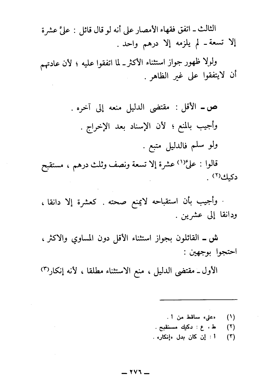 الْأَوَّلُ - مُقْتَضَى الدَّلِيلِ مَنْعُ الِاسْتِثْنَاءِ مُطْلَقًا، لِأَنَّهُ إِنْكَارٌ