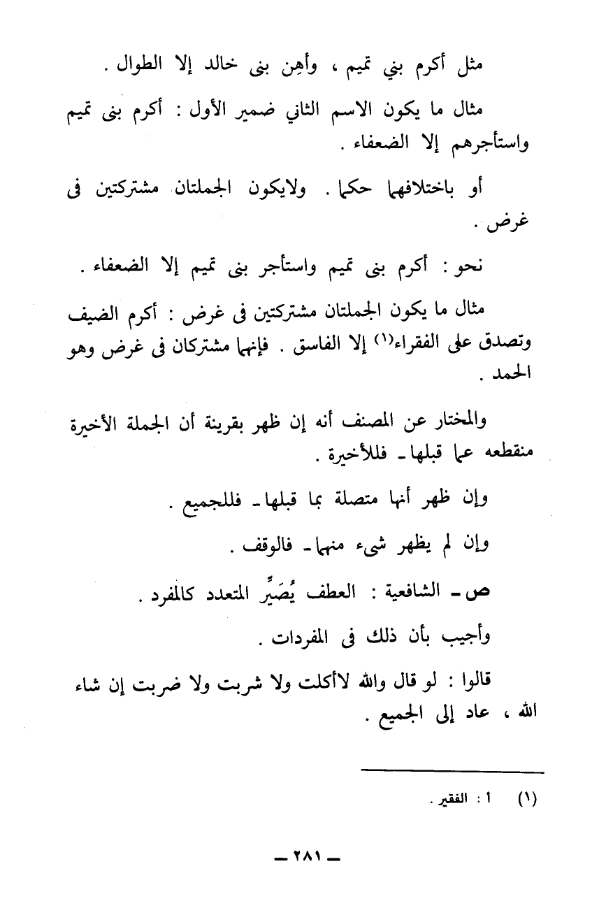 مِثَالُ مَا يَكُونُ الْجُمْلَتَانِ مُشْتَرِكَتَيْنِ فِي غَرَضٍ: أَكْرِمِ الضَّيْفَ وَتَصَدَّقْ عَلَى الْفُقَرَاءِ إِلَّا الْفَاسِقَ، فَإِنَّهُمَا مُشْتَرِكَانِ فِي غَرَضٍ وَهُوَ الْحَمْدُ.