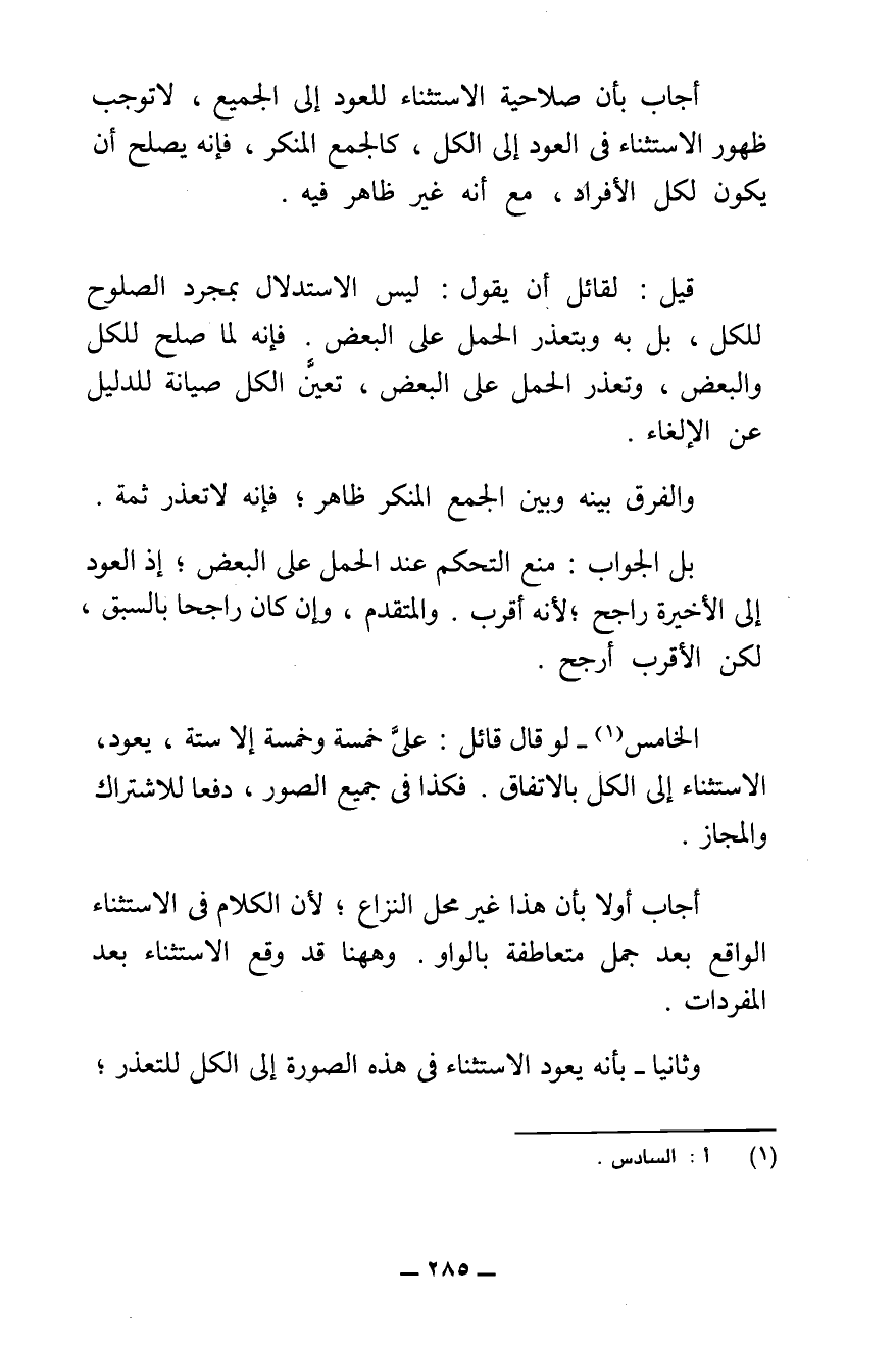 أَجَابَ بِأَنَّ صَلَاحِيَةَ الِاسْتِثْنَاءِ لِلْعَوْدِ إِلَى الْجَمِيعِ لَا تُوجِبُ ظُهُورَ الِاسْتِثْنَاءِ فِي الْعَوْدِ إِلَى الْكُلِّ، كَالْجَمْعِ الْمُنَكَّرِ، فَإِنَّهُ يَصْلُحُ أَنْ يَكُونَ لِكُلِّ الْأَفْرَادِ، مَعَ أَنَّهُ غَيْرُ ظَاهِرٍ فِيهِ.