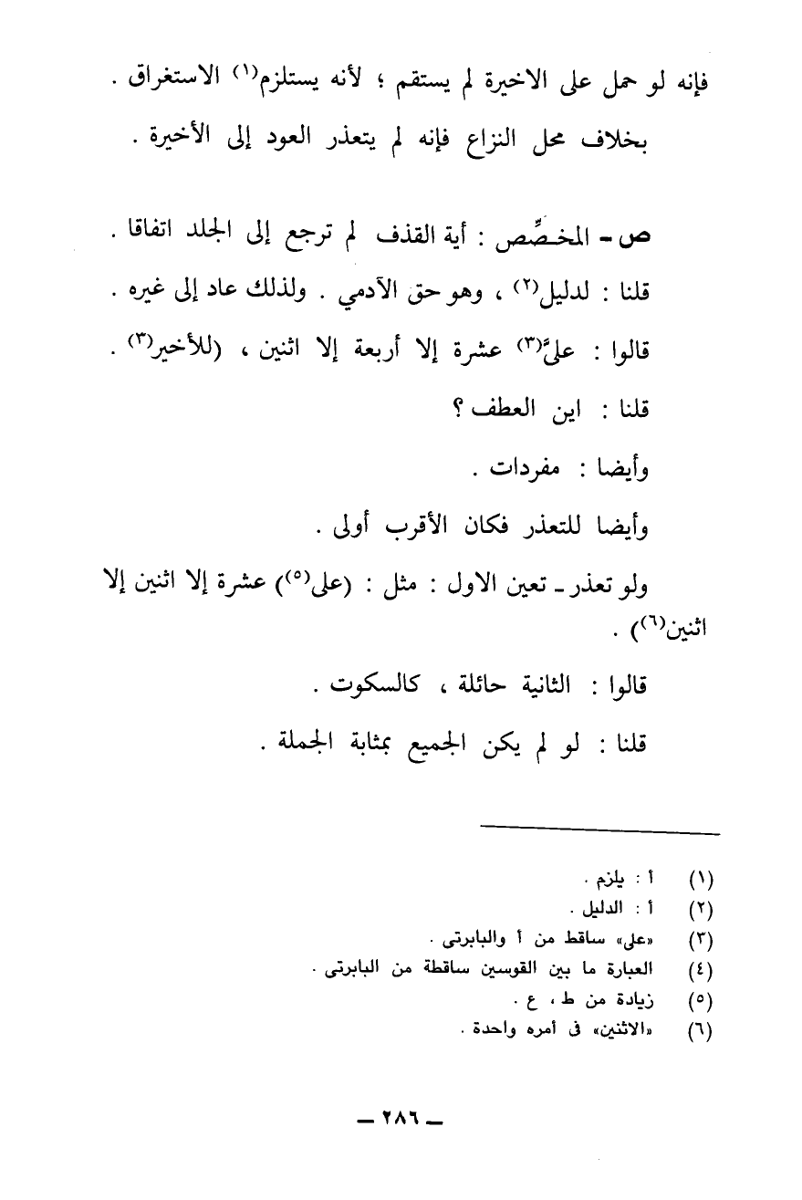 ش - احْتَجَّ مُخَصِّصُ الِاسْتِثْنَاءِ بِالْجُمْلَةِ الْأَخِيرَةِ بِخَمْسَةِ وُجُوهٍ: