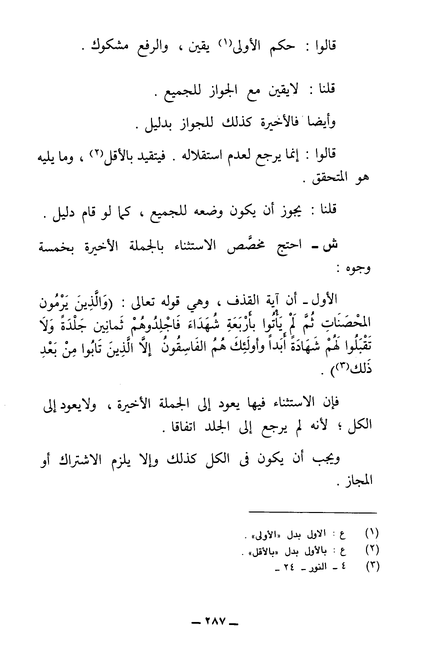 ص - (مَسْأَلَةٌ) الِاسْتِثْنَاءُ مِنَ الْإِثْبَاتِ نَفْيٌ، وَبِالْعَكْسِ، خِلَافًا لِأَبِي حَنِيفَةَ رَحِمَهُ اللَّهُ.