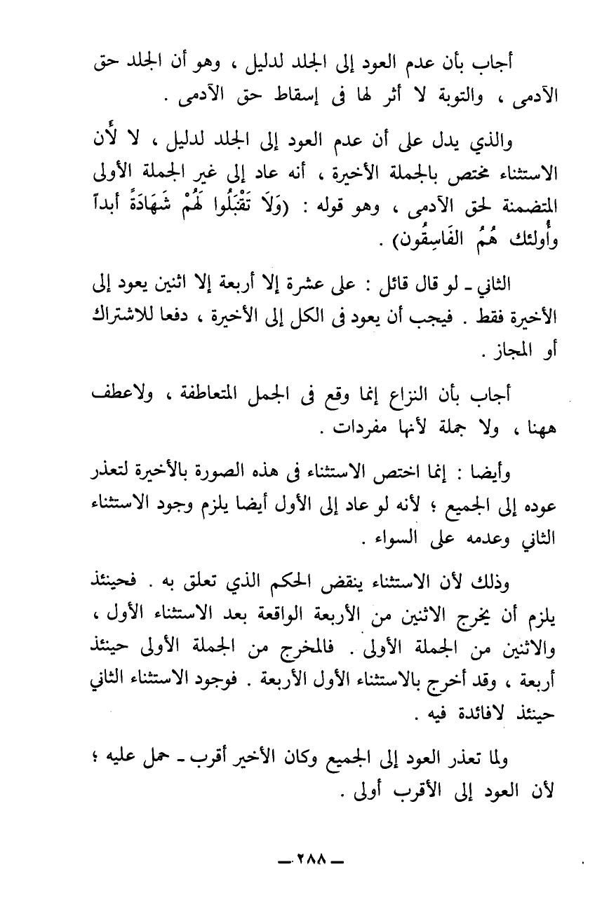 وَالَّذِي يَدُلُّ عَلَى أَنَّ عَدَمَ الْعَوْدِ إِلَى الْجَلْدِ لِدَلِيلٍ، لَا لِأَنَّ الِاسْتِثْنَاءَ مُخْتَصٌّ بِالْجُمْلَةِ الْأَخِيرَةِ - أَنَّهُ عَادَ إِلَى غَيْرِ الْجُمْلَةِ الْأُولَى الْمُتَضَمِّنَةِ لِحَقِّ الْآدَمِيِّ، وَهُوَ قَوْلُهُ: {وَلَا تَقْبَلُوا لَهُمْ شَهَادَةً أَبَدًا وَأُولَئِكَ هُمُ الْفَاسِقُونَ} [النور: ٤] .