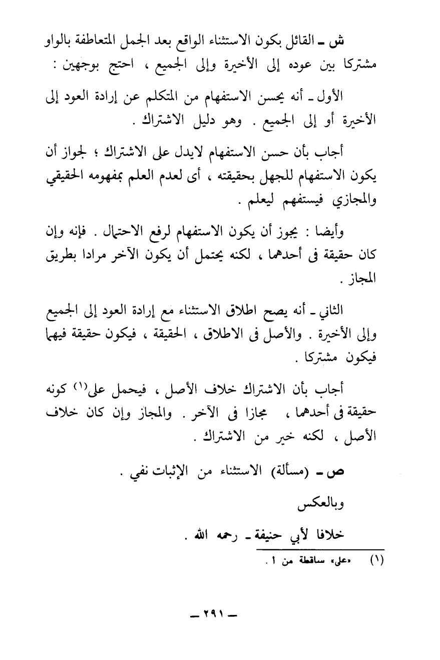 الثَّانِي - أَنَّهُ يَصِحُّ إِطْلَاقُ الِاسْتِثْنَاءِ مَعَ إِرَادَةِ الْعَوْدِ إِلَى الْجَمِيعِ وَإِلَى الْأَخِيرَةِ، وَالْأَصْلُ فِي الْإِطْلَاقِ الْحَقِيقَةُ، فَيَكُونُ حَقِيقَةً فِيهِمَا فَيَكُونُ مُشْتَرَكًا.