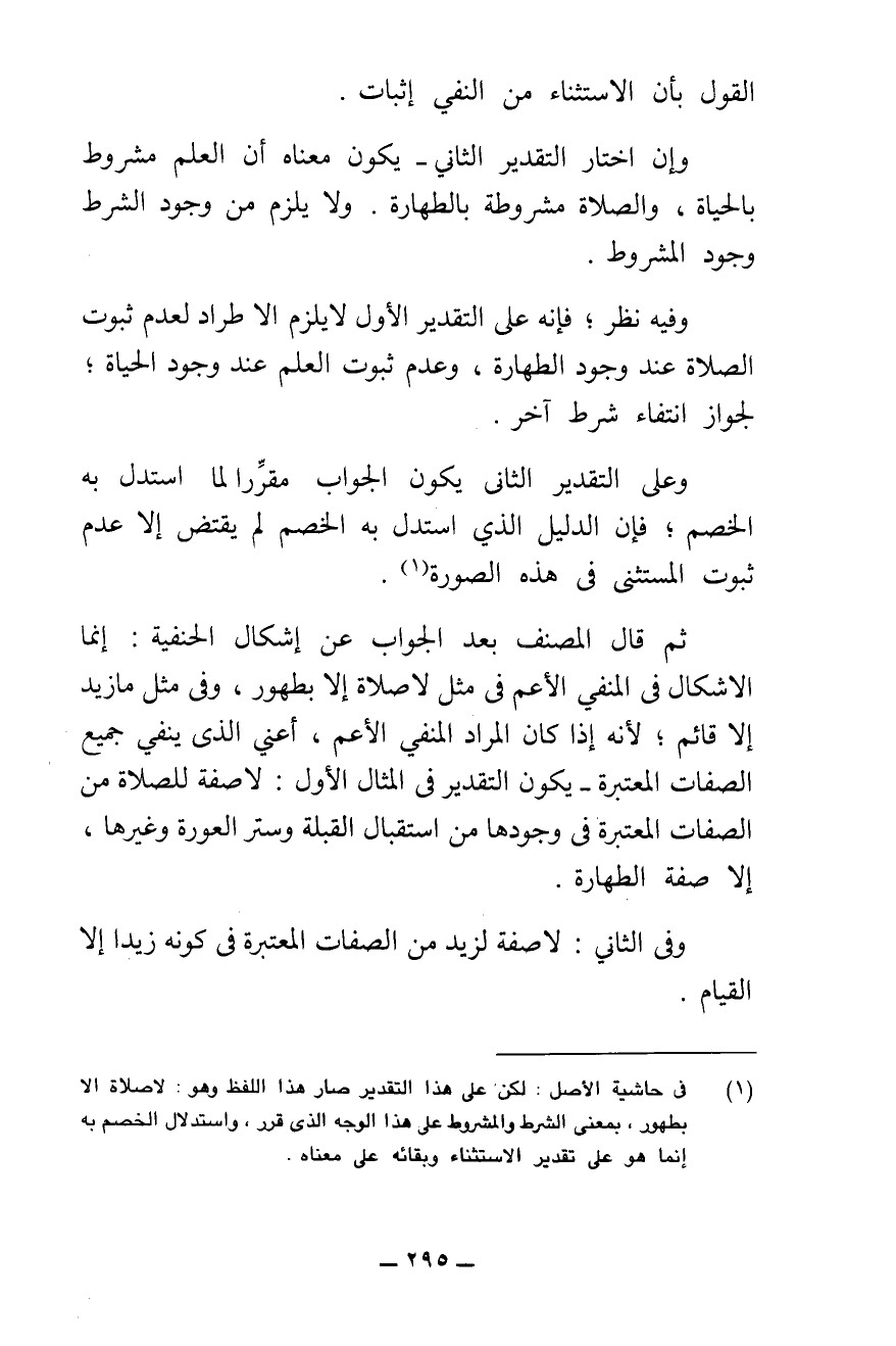 ثُمَّ قَالَ الْمُصَنِّفُ بَعْدَ الْجَوَابِ عَنْ إِشْكَالِ الْحَنَفِيَّةِ: إِنَّمَا الْإِشْكَالُ فِي الْمَنْفِيِّ الْأَعَمِّ فِي مِثْلِ لَا صَلَاةَ إِلَّا بِطَهُورٍ، وَفِي مِثْلِ مَا زَيْدٌ إِلَّا قَائِمٌ ; لِأَنَّهُ إِذَا كَانَ الْمُرَادُ الْمَنْفِيَّ الْأَعَمَّ، أَعْنِي الَّذِي يَنْفِي جَمِيعَ الصِّفَاتِ الْمُعْتَبَرَةِ - يَكُونُ التَّقْدِيرُ فِي الْمِثَالِ الْأَوَّلِ: لَا صِفَةَ لِلصَّلَاةِ مِنَ الصِّفَاتِ الْمُعْتَبَرَةِ فِي وُجُودِهَا مِنَ اسْتِقْبَالِ الْقِبْلَةِ وَسَتْرِ الْعَوْرَةِ وَغَيْرِهَا، إِلَّا صِفَةُ الطَّهَارَةِ.