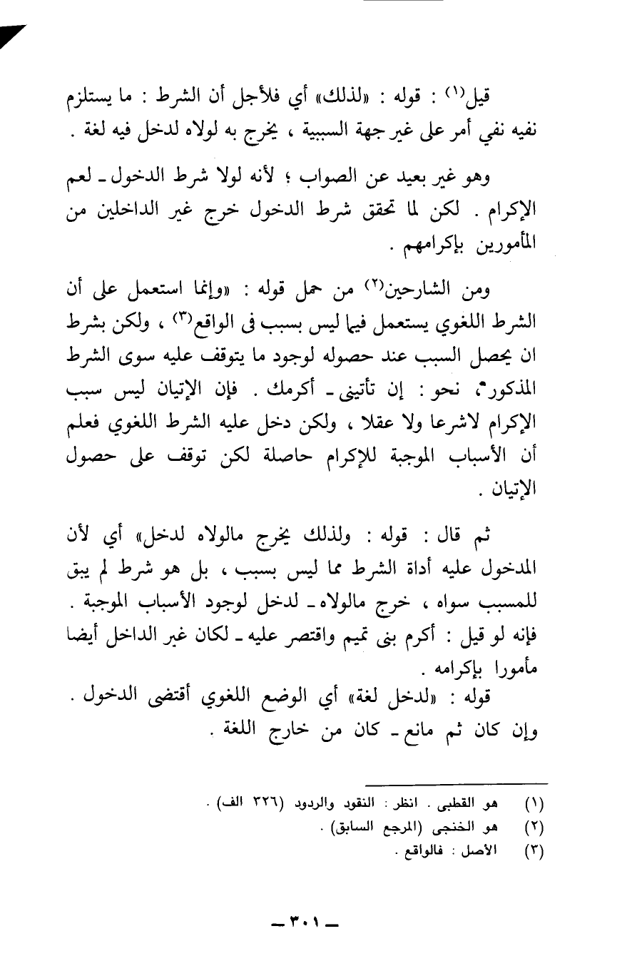 ثُمَّ قَالَ: قَوْلُهُ: وَلِذَلِكَ يَخْرُجُ مَا لَوْلَاهُ لَدَخَلَ " أَيْ لِأَنَّ الْمَدْخُولَ عَلَيْهِ أَدَاةُ الشَّرْطِ مِمَّا لَيْسَ بِسَبَبٍ، بَلْ هُوَ شَرْطٌ لَمْ يَبْقَ لِلْمُسَبِّبِ سِوَاهُ، خَرَجَ مَا لَوْلَاهُ - لَدَخَلَ لِوُجُودِ الْأَسْبَابِ الْمُوجِبَةِ، فَإِنَّهُ لَوْ قِيلَ: أَكْرِمْ بَنِي تَمِيمٍ وَاقْتَصَرَ عَلَيْهِ - لَكَانَ غَيْرُ الدَّاخِلِ أَيْضًا مَأْمُورًا بِإِكْرَامِهِ.