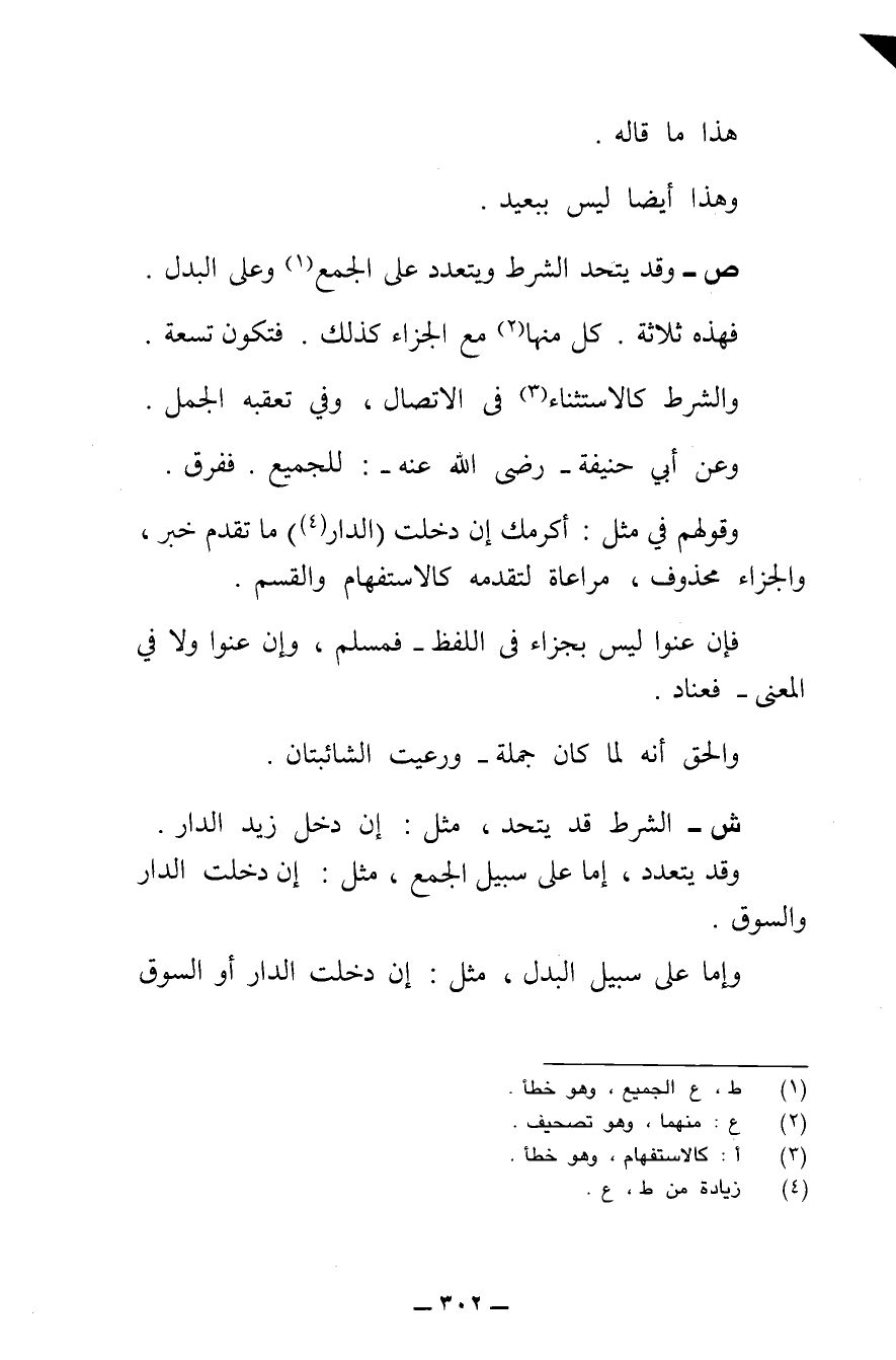 ش - الشَّرْطُ قَدْ يَتَّحِدُ، مِثْلَ: إِنْ دَخَلَ زَيْدٌ الدَّارَ، وَقَدْ يَتَعَدَّدُ، إِمَّا عَلَى سَبِيلِ الْجَمْعِ، مِثْلَ: إِنْ دَخَلْتَ الدَّارَ وَالسُّوقَ، وَإِمَّا عَلَى سَبِيلِ الْبَدَلِ ; مِثْلَ: إِنْ دَخَلْتَ الدَّارَ أَوِ السُّوقَ