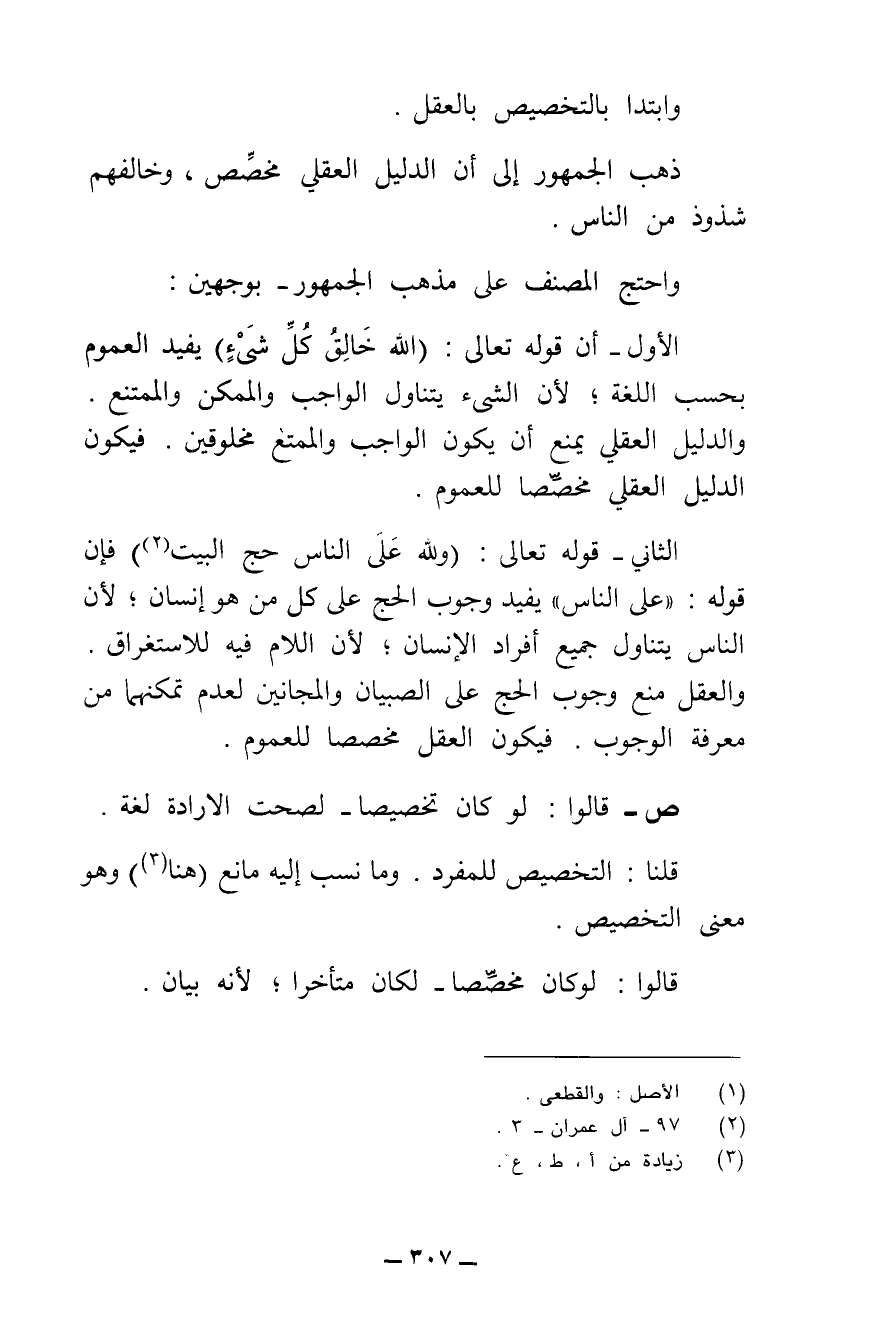 الْأَوَّلُ - أَنَّ قَوْلَهُ تَعَالَى: {اللَّهُ خَالِقُ كُلِّ شَيْءٍ} [الرعد: ١٦] يُفِيدُ الْعُمُومَ بِحَسَبِ اللُّغَةِ ; لِأَنَّ الشَّيْءَ يَتَنَاوَلُ الْوَاجِبَ وَالْمُمْكِنَ وَالْمُمْتَنِعَ. وَالدَّلِيلُ الْعَقْلِيُّ يَمْنَعُ أَنْ يَكُونَ الْوَاجِبُ وَالْمُمْتَنِعُ مَخْلُوقَيْنِ. فَيَكُونُ الدَّلِيلُ الْعَقْلِيُّ مُخَصِّصًا لِلْعُمُومِ.