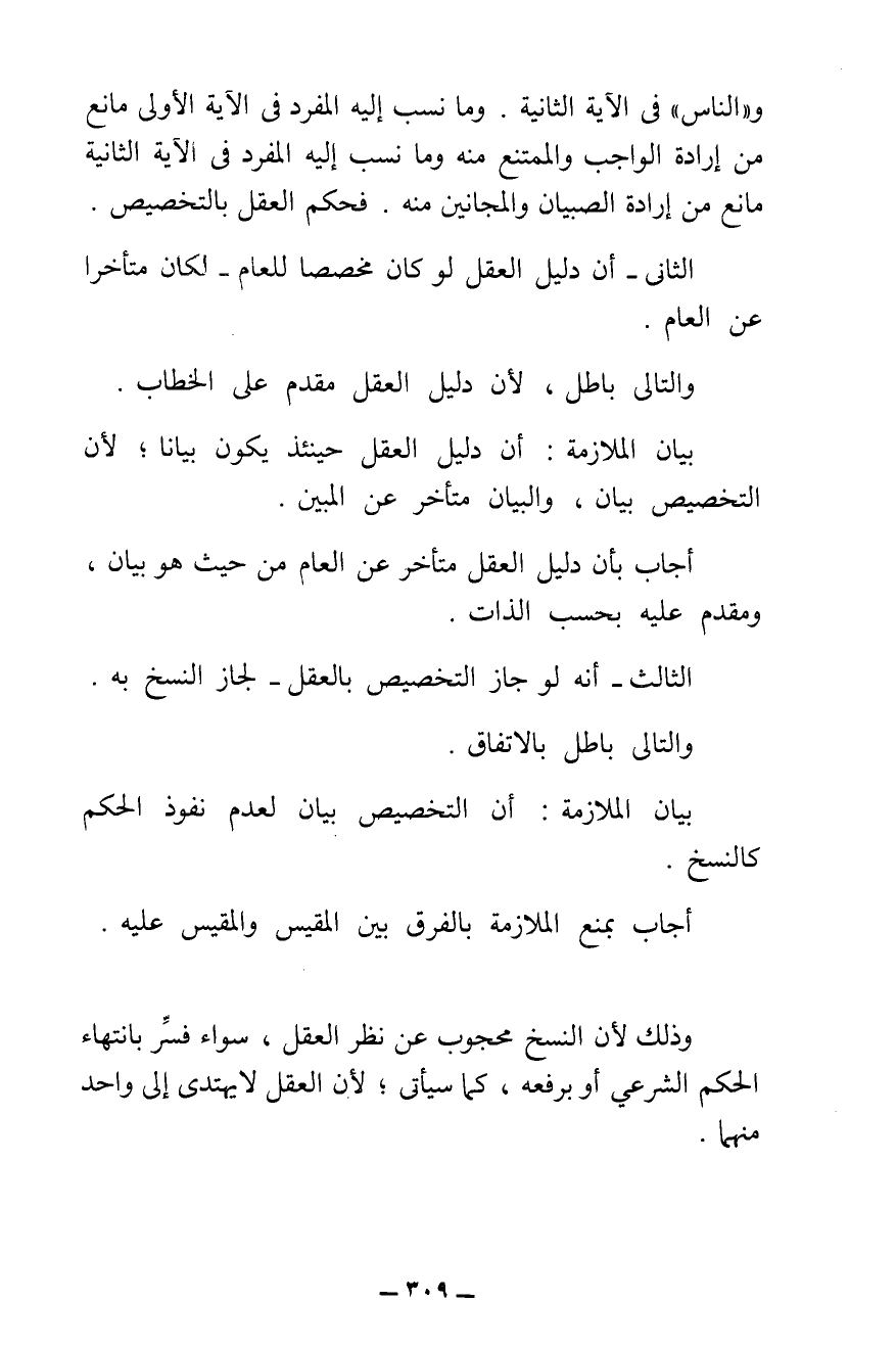 وَ " النَّاسِ " فِي الْآيَةِ الثَّانِيَةِ، وَمَا نُسِبَ إِلَيْهِ الْمُفْرَدُ فِي الْآيَةِ الْأُولَى مَانِعٌ مِنْ إِرَادَةِ الْوَاجِبِ وَالْمُمْتَنِعِ مِنْهُ، وَمَا نُسِبَ إِلَيْهِ الْمُفْرَدُ فِي الْآيَةِ الثَّانِيَةِ مَانِعٌ مِنْ إِرَادَةِ الصِّبْيَانِ وَالْمَجَانِينِ مِنْهُ، فَحُكْمُ الْعَقْلِ بِالتَّخْصِيصِ.