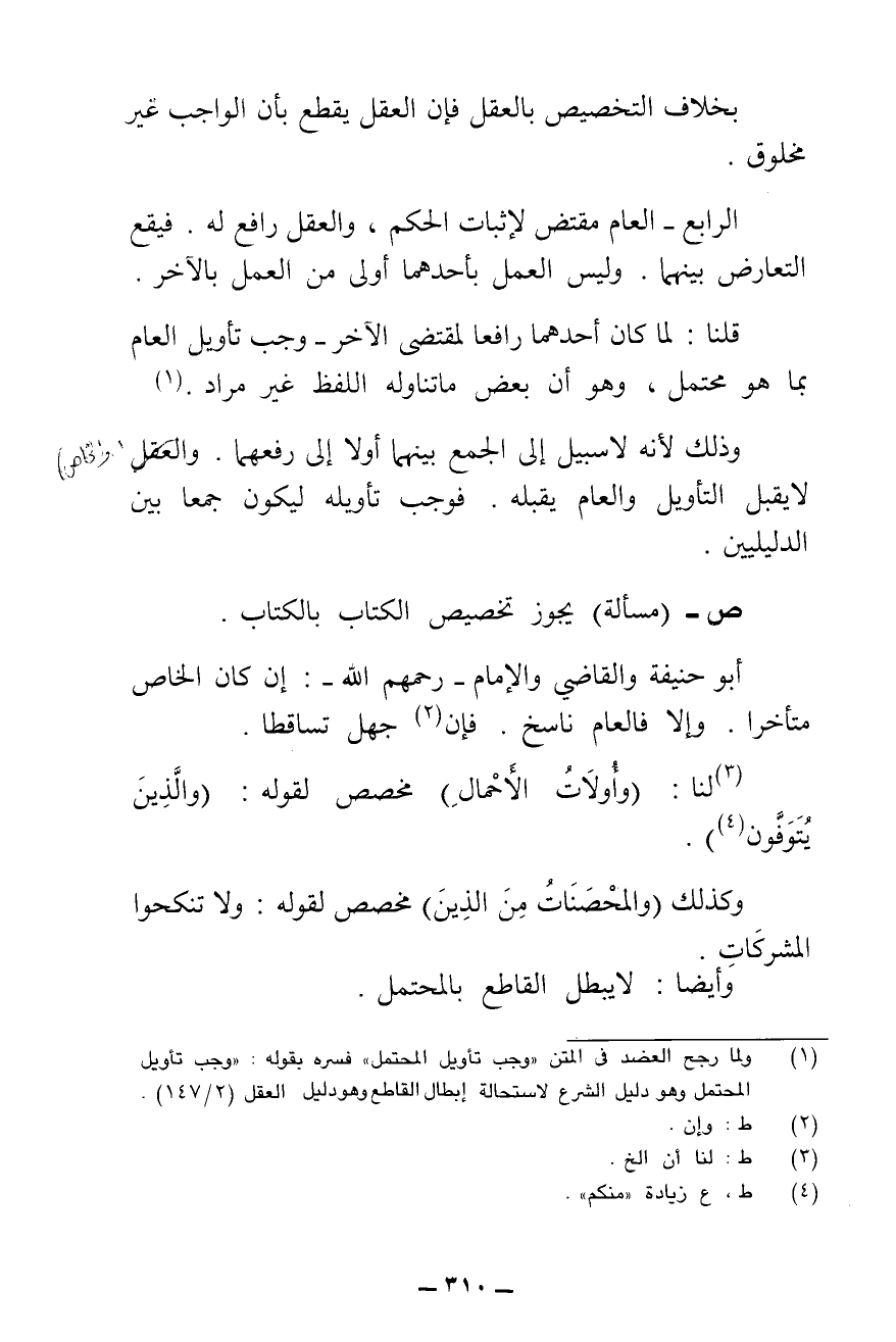 الرَّابِعُ - الْعَامُّ مُقْتَضٍ لِإِثْبَاتِ الْحُكْمِ، وَالْعَقْلُ رَافِعٌ لَهُ، فَيَقَعُ التَّعَارُضُ بَيْنَهُمَا، وَلَيْسَ الْعَمَلُ بِأَحَدِهِمَا أَوْلَى مِنَ الْعَمَلِ بِالْآخَرِ.