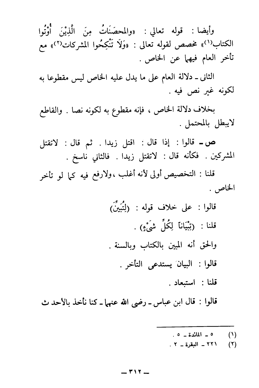 وَأَيْضًا: قَوْلُهُ تَعَالَى: {وَالْمُحْصَنَاتُ مِنَ الَّذِينَ أُوتُوا الْكِتَابَ} [المائدة: ٥] مُخَصِّصٌ لِقَوْلِهِ تَعَالَى: {وَلَا تَنْكِحُوا الْمُشْرِكَاتِ} [البقرة: ٢٢١] " مَعَ تَأَخُّرِ الْعَامِّ فِيهِمَا عَنِ الْخَاصِّ.