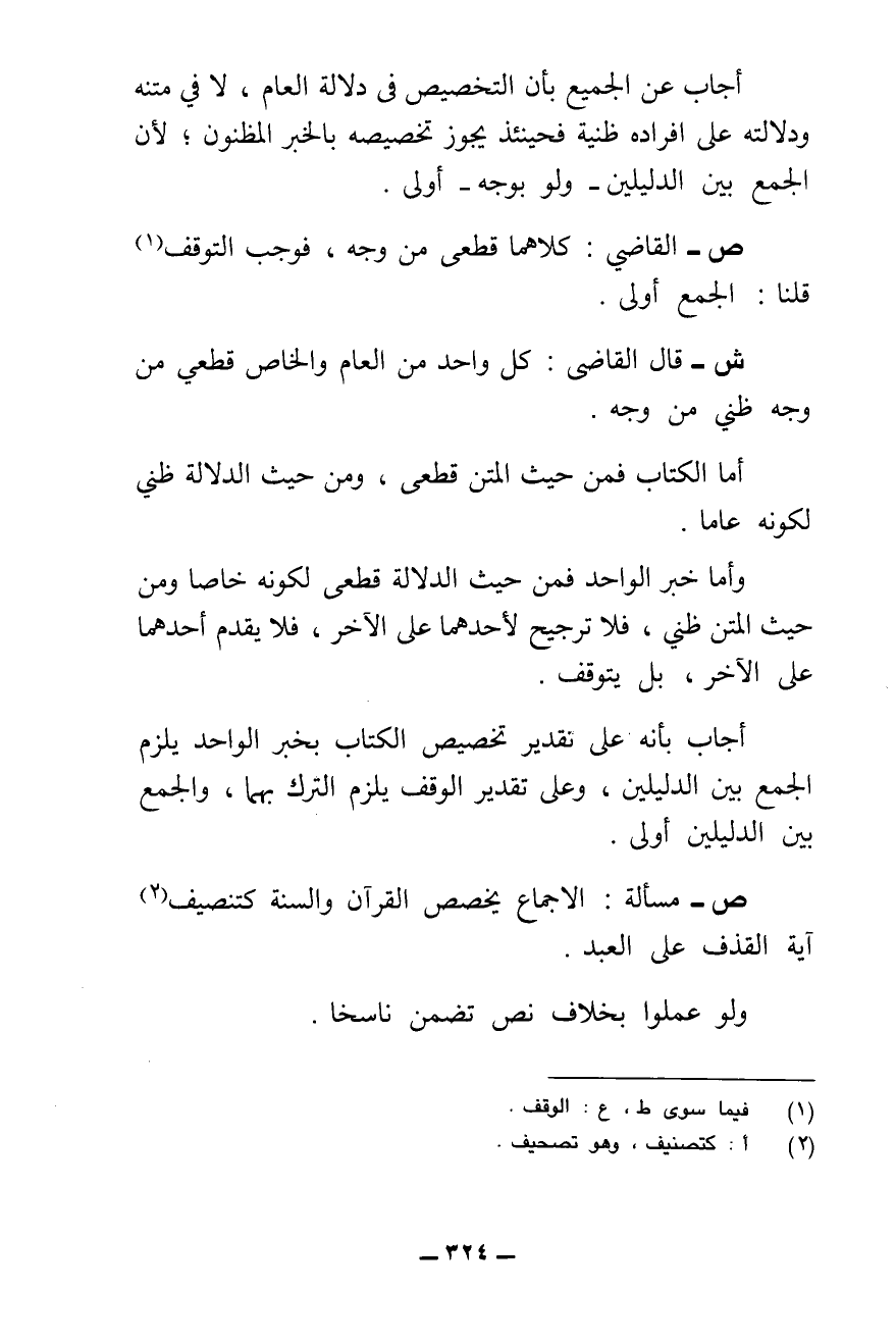 ش - قَالَ الْقَاضِي: كُلُّ وَاحِدٍ مِنَ الْعَامِّ وَالْخَاصِّ قَطْعِيٌّ مِنْ وَجْهٍ ظَنِّيٌّ مِنْ وَجْهٍ.
