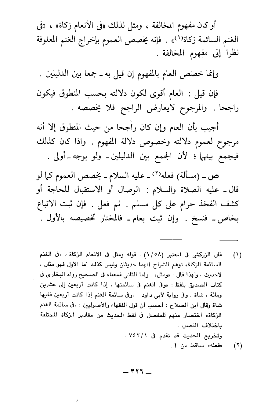 أَوْ كَانَ مَفْهُومَ الْمُخَالَفَةِ، وَمَثَّلَ لِذَلِكَ: " «فِي الْأَنْعَامِ زَكَاةٌ» "، " «فِي الْغَنَمِ السَّائِمَةِ زَكَاةٌ» "؛ فَإِنَّهُ يُخَصِّصُ الْعُمُومَ بِإِخْرَاجِ الْغَنَمِ الْمَعْلُوفَةِ نَظَرًا إِلَى مَفْهُومِ الْمُخَالَفَةِ.