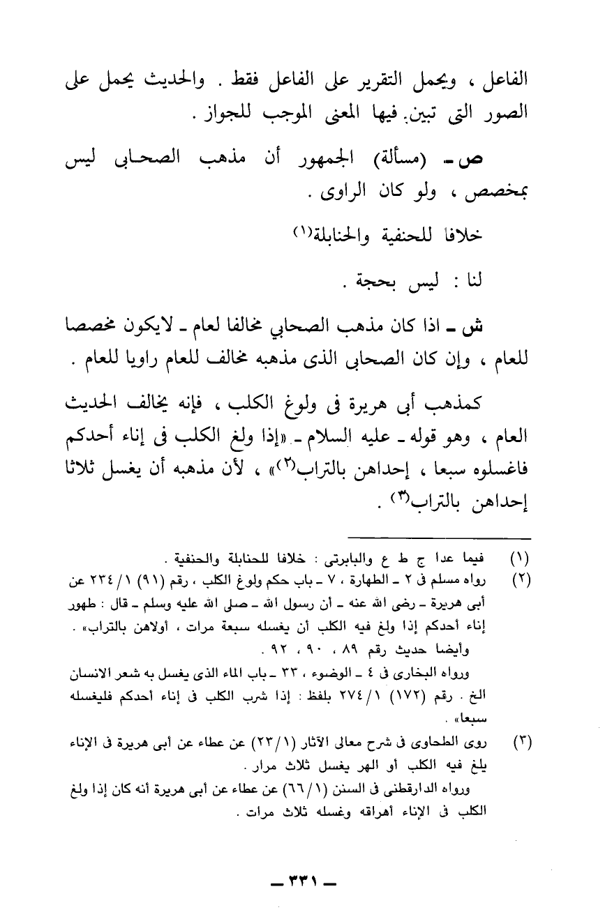 كَمَذْهَبِ أَبِي هُرَيْرَةَ فِي وُلُوغِ الْكَلْبِ، فَإِنَّهُ يُخَالِفُ الْحَدِيثَ الْعَامَّ، وَهُوَ قَوْلُهُ - عَلَيْهِ السَّلَامُ - " «إِذَا وَلَغَ الْكَلْبُ فِي إِنَاءِ أَحَدِكُمْ فَاغْسِلُوهُ سَبْعًا، إِحْدَاهُنَّ بِالتُّرَابِ» "، لِأَنَّ مَذْهَبَهُ أَنْ يُغْسَلَ ثَلَاثًا إِحْدَاهُنَّ بِالتُّرَابِ.
