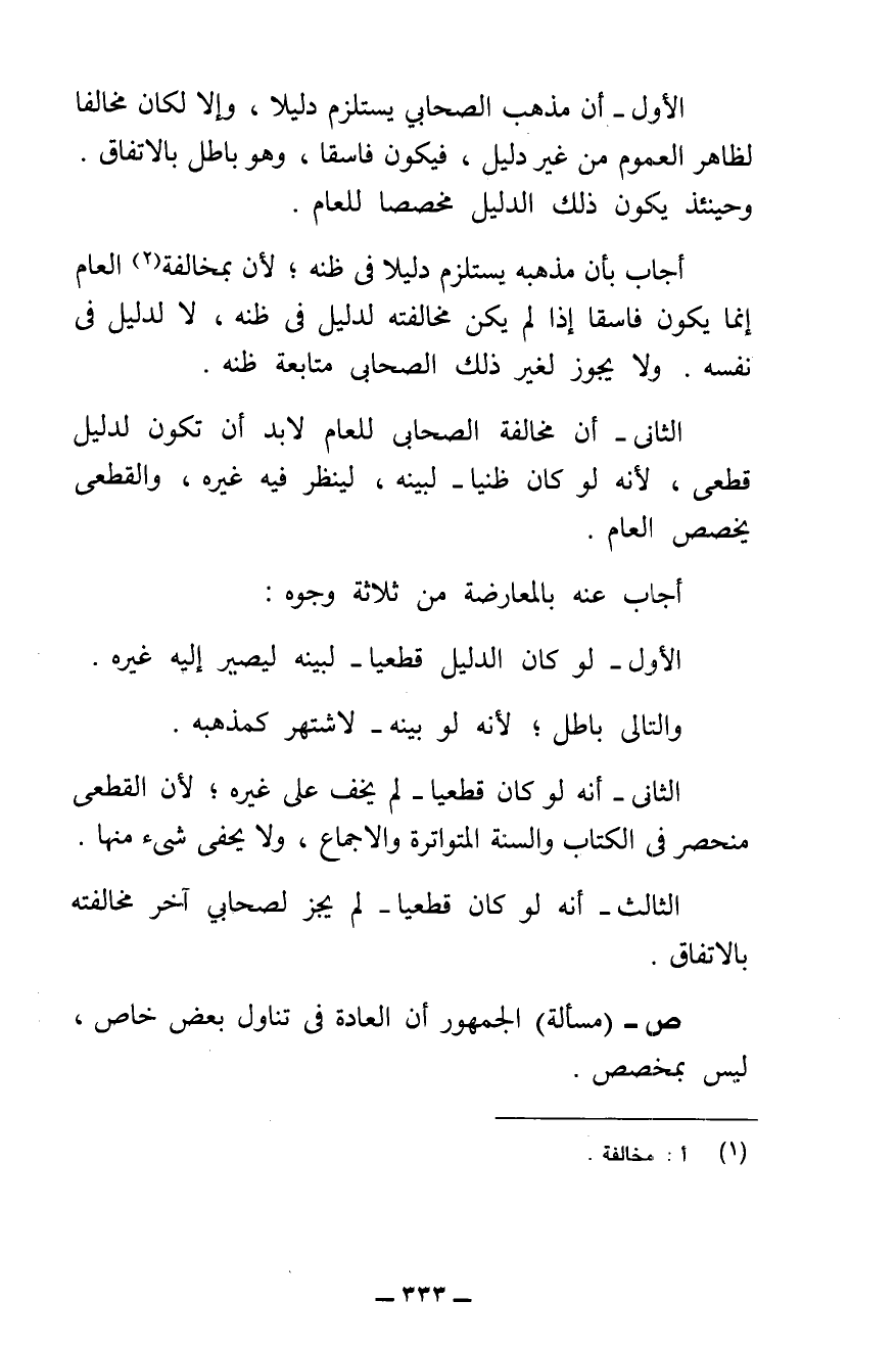 الْأَوَّلُ - أَنَّ مَذْهَبَ الصَّحَابِيِّ يَسْتَلْزِمُ دَلِيلًا، وَإِلَّا لَكَانَ مُخَالِفًا لِظَاهِرِ الْعُمُومِ مِنْ غَيْرِ دَلِيلٍ، فَيَكُونُ فَاسِقًا، وَهُوَ بَاطِلٌ بِالِاتِّفَاقِ. وَحِينَئِذٍ يَكُونُ ذَلِكَ الدَّلِيلُ مُخَصِّصًا لِلْعَامِّ.