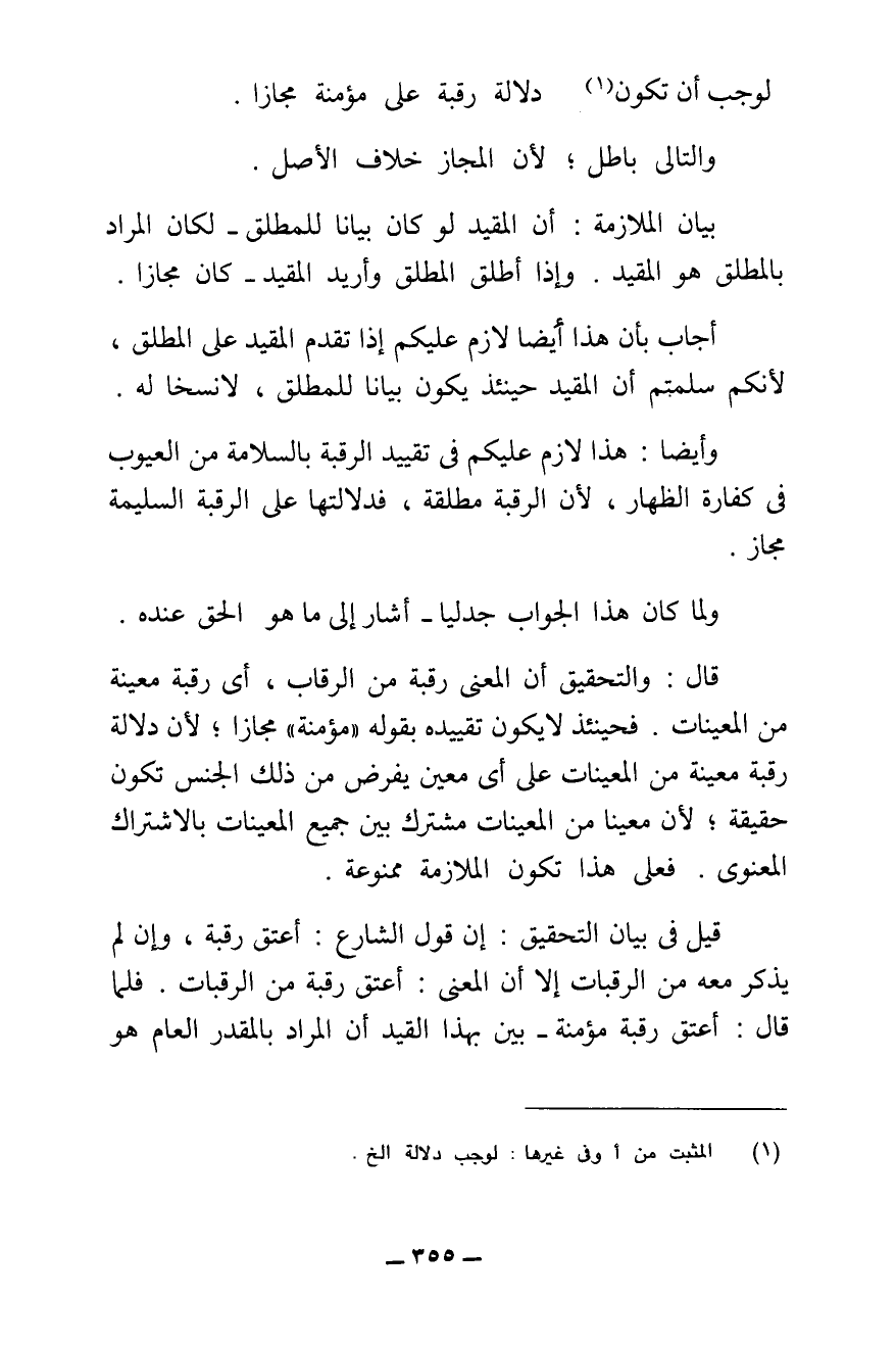 قَالَ: وَالتَّحْقِيقُ أَنَّ الْمَعْنَى رَقَبَةٌ مِنَ الرِّقَابِ، أَيْ رَقَبَةٌ مُعَيَّنَةٌ مِنَ الْمُعَيَّنَاتِ، فَحِينَئِذٍ لَا يَكُونُ تَقْيِيدُهُ بِقَوْلِهِ " مُؤْمِنَةٍ " مَجَازًا ; لِأَنَّ دَلَالَةَ رَقَبَةٍ مُعَيَّنَةٍ مِنَ الْمُعَيَّنَاتِ عَلَى أَيِّ مُعَيَّنٍ يُفْرَضُ مِنْ ذَلِكَ الْجِنْسِ تَكُونُ حَقِيقَةً ; لِأَنَّ مُعَيَّنًا مِنَ الْمُعَيَّنَاتِ مُشْتَرَكٌ بَيْنَ جَمِيعِ الْمُعَيَّنَاتِ بِالِاشْتِرَاكِ الْمَعْنَوِيِّ، فَعَلَى هَذَا تَكُونُ الْمُلَازَمَةُ مَمْنُوعَةً.