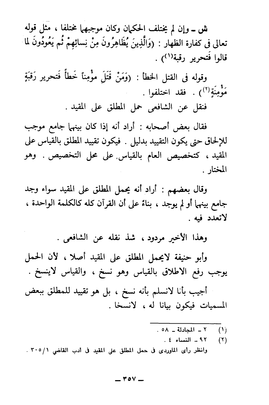 وَقَوْلِهِ فِي الْقَتْلِ الْخَطَأِ: {وَمَنْ قَتَلَ مُؤْمِنًا خَطَأً فَتَحْرِيرُ رَقَبَةٍ مُؤْمِنَةٍ} [النساء: ٩٢] . فَقَدِ اخْتَلَفُوا.