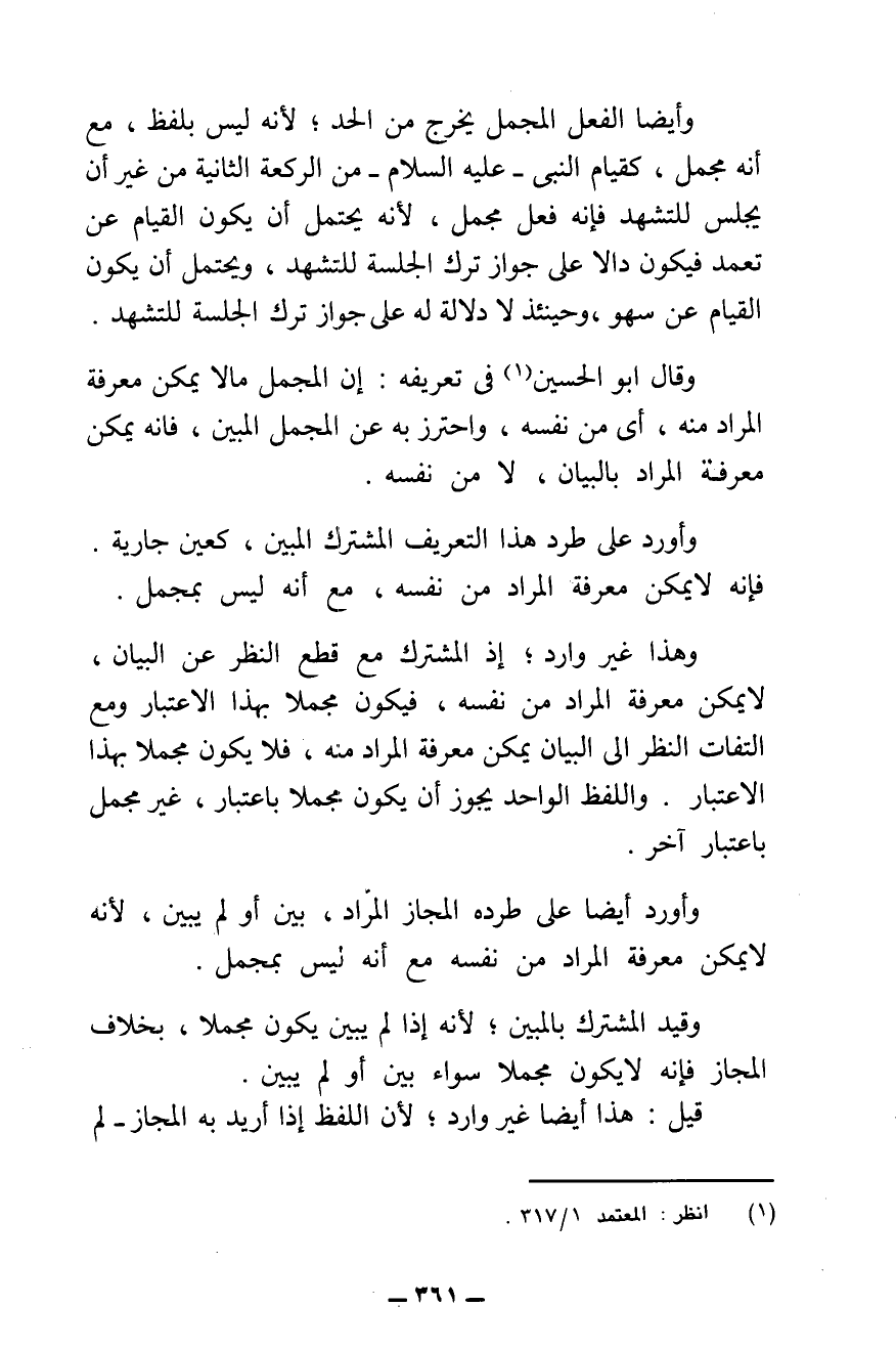 وَأَيْضًا الْفِعْلُ الْمُجْمَلُ يَخْرُجُ مِنَ الْحَدِّ ; لِأَنَّهُ لَيْسَ بِلَفْظٍ، مَعَ أَنَّهُ مُجْمَلٌ، كَقِيَامِ النَّبِيِّ - عَلَيْهِ السَّلَامُ - مِنَ الرَّكْعَةِ الثَّانِيَةِ مِنْ غَيْرِ أَنْ يَجْلِسَ لِلتَّشَهُّدِ؛ فَإِنَّهُ فِعْلٌ مُجْمَلٌ؛ لِأَنَّهُ يُحْتَمَلُ أَنْ يَكُونَ الْقِيَامُ عَنْ تَعَمُّدٍ فَيَكُونُ دَالًّا عَلَى جَوَازِ تَرْكِ الْجَلْسَةِ لِلتَّشَهُّدِ.