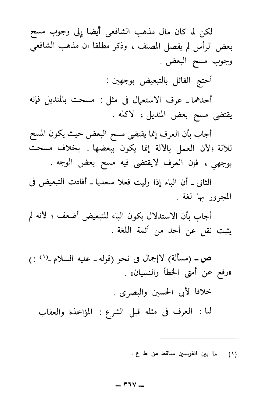 أَحَدُهُمَا - عُرْفُ الِاسْتِعْمَالِ فِي مِثْلِ: مَسَحْتُ بِالْمَنْدِيلِ فَإِنَّهُ يَقْتَضِي مَسْحَ بَعْضِ الْمَنْدِيلِ، لَا كُلِّهِ.