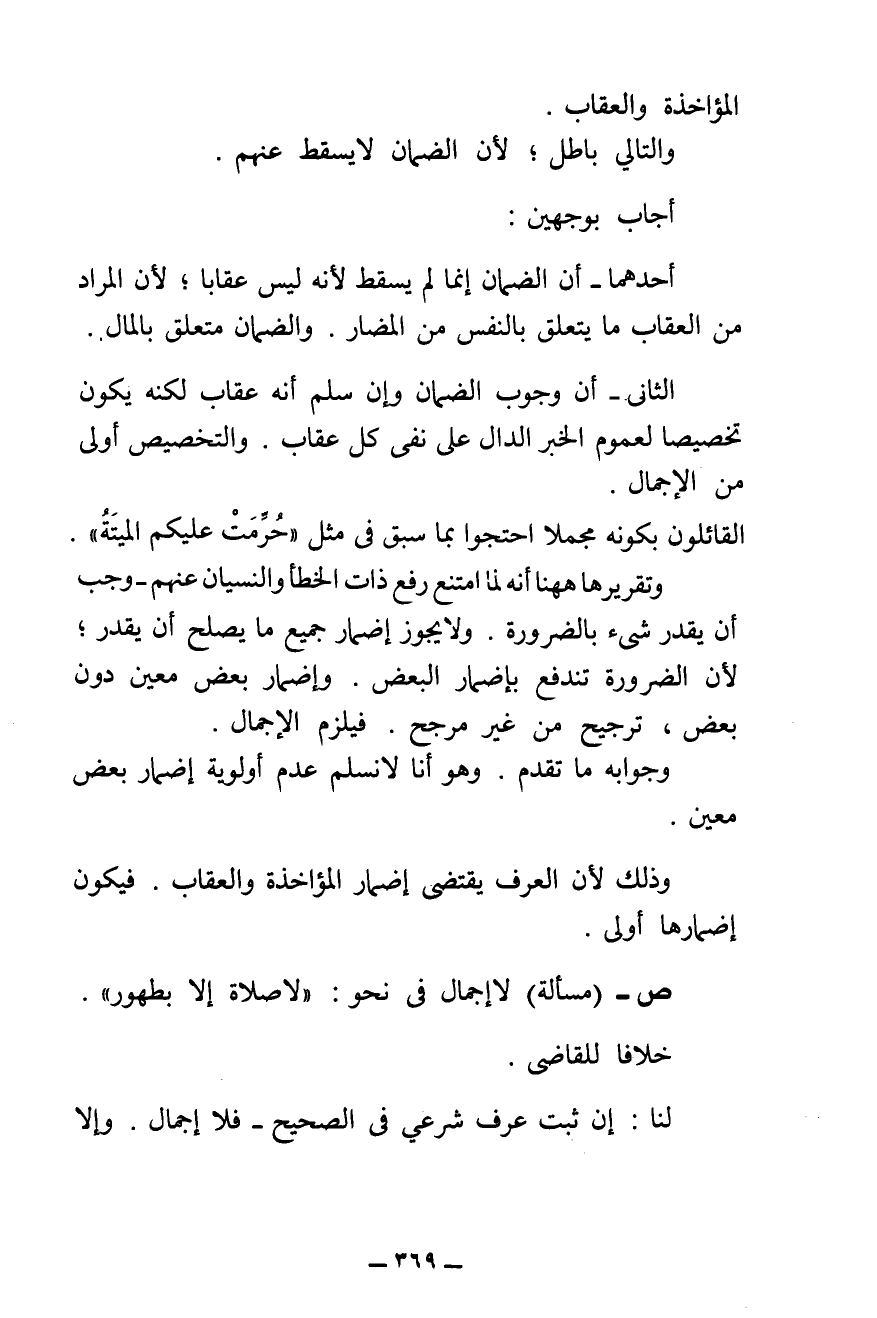 الثَّانِي - أَنَّ وُجُوبَ الضَّمَانِ وَإِنْ سُلِّمَ أَنَّهُ عِقَابٌ لَكِنَّهُ يَكُونُ تَخْصِيصًا لِعُمُومِ الْخَبَرِ الدَّالِّ عَلَى نَفْيِ كُلِّ عِقَابٍ، وَالتَّخْصِيصُ أَوْلَى مِنَ الْإِجْمَالِ.