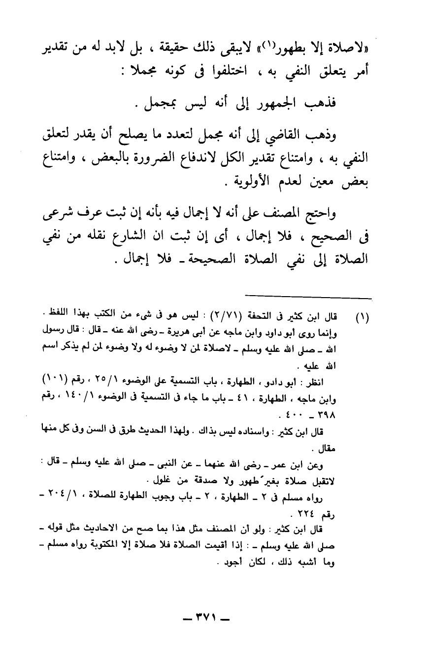 " «لَا صَلَاةَ إِلَّا بِطَهُورٍ» " لَا يَبْقَى ذَلِكَ حَقِيقَةً، بَلْ لَا بُدَّ لَهُ مِنْ تَقْدِيرِ أَمْرٍ يَتَعَلَّقُ النَّفْيُ بِهِ - اخْتَلَفُوا فِي كَوْنِهِ مُجْمَلًا: