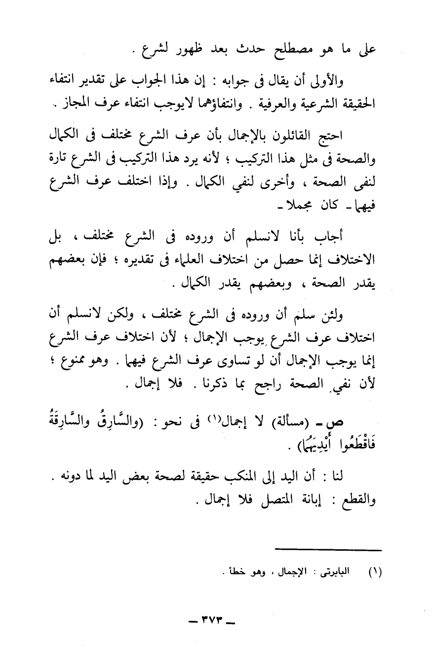 ش - لَا إِجْمَالَ فِي قَوْلِهِ تَعَالَى: {وَالسَّارِقُ وَالسَّارِقَةُ فَاقْطَعُوا أَيْدِيَهُمَا} [المائدة: ٣٨] مِنْ جِهَةِ الْيَدِ وَالْقَطْعِ، خِلَافًا لِبَعْضِ الْأُصُولِيِّينَ، وَالدَّلِيلُ عَلَى أَنَّهُ لَا إِجْمَالَ فِيهِ أَنَّ الْيَدَ لِمَجْمُوعِ الْعُضْوِ مِنَ الْأَنَامِلِ إِلَى الْمَنْكِبِ حَقِيقَةً ; لِصِحَّةِ قَوْلِنَا بَعْضُ الْيَدِ عَلَى مَا دُونَ الْمَنْكِبِ، وَامْتِنَاعِ أَنْ يَكُونَ بَعْضُ الشَّيْءِ نَفْسَهُ.