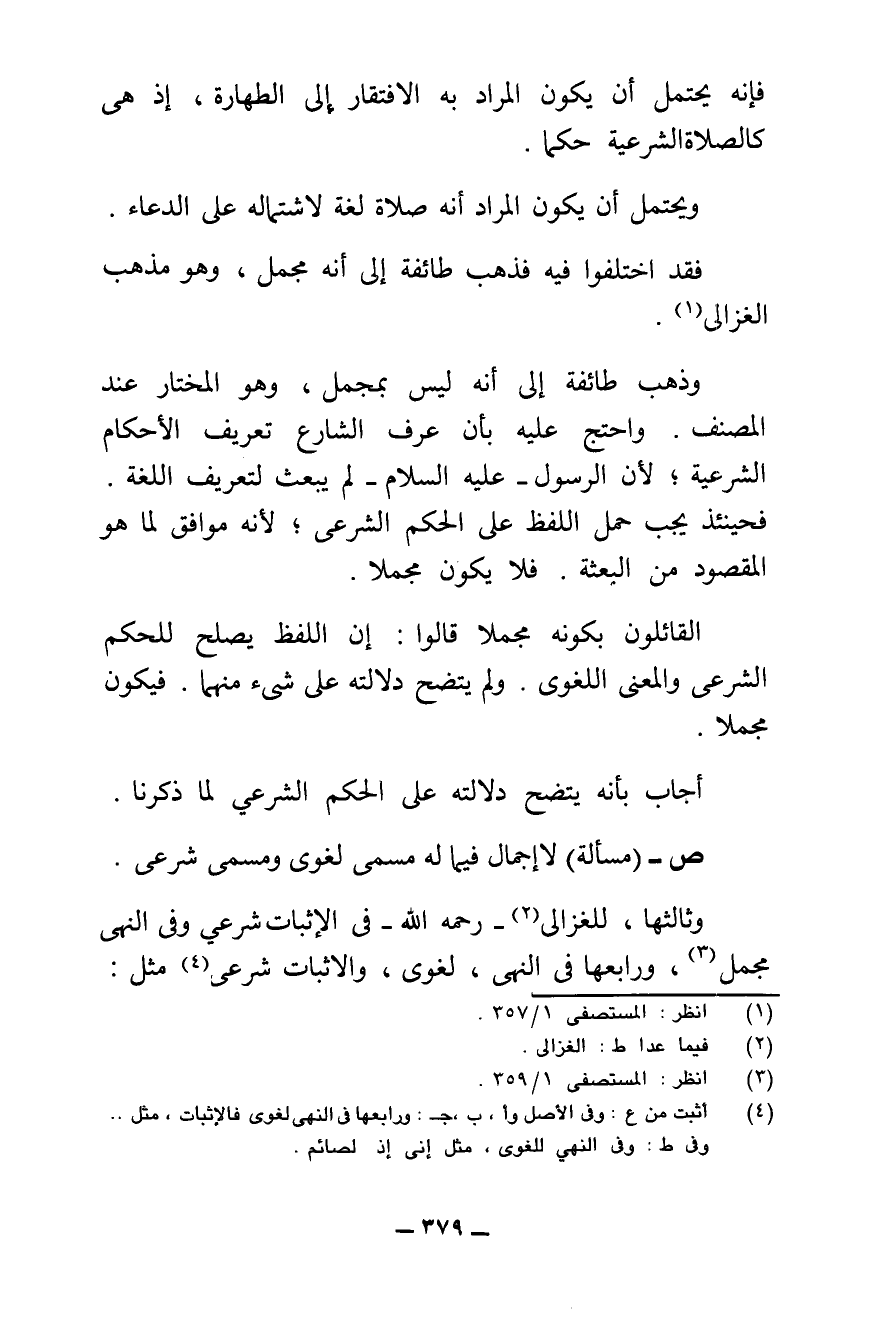 ش - إِذَا وَرَدَ لَفْظٌ فِي الشَّرْعِ لَهُ مُسَمًّى لُغَوِيٌّ وَمُسَمًّى شَرْعِيٌّ مِنْ غَيْرِ ظُهُورِ أَحَدِهِمَا فَقَدِ اخْتَلَفُوا فِيهِ عَلَى أَرْبَعَةِ مَذَاهِبَ: أَحَدُهَا - أَنَّهُ لَا إِجْمَالَ فِيهِ - وَهُوَ الْمُخْتَارُ عِنْدَ الْمُصَنِّفِ.