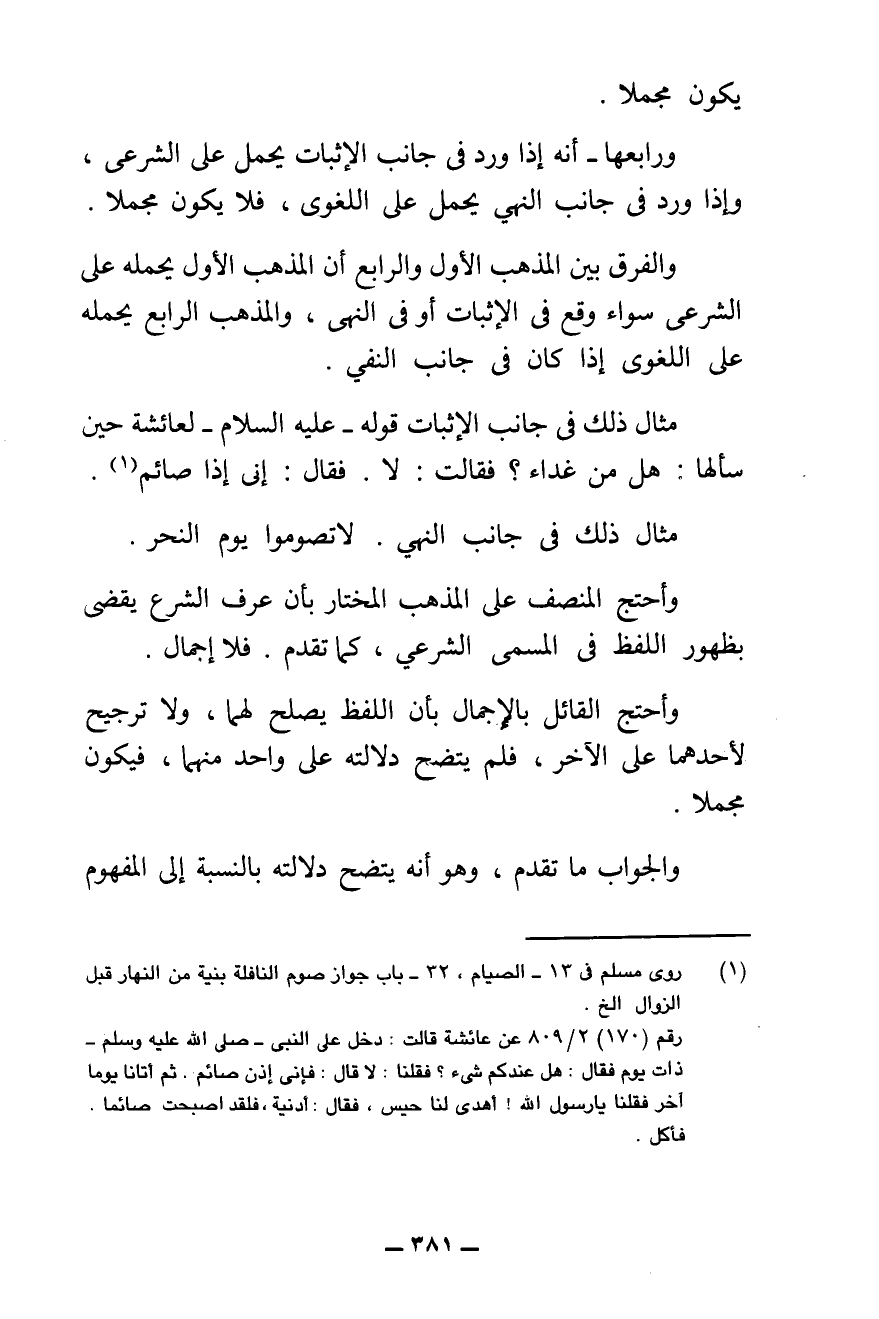 وَرَابِعُهَا - أَنَّهُ إِذَا وَرَدَ فِي جَانِبِ الْإِثْبَاتِ يُحْمَلُ عَلَى الشَّرْعِيِّ، وَإِذَا وَرَدَ فِي جَانِبِ النَّهْيِ يُحْمَلُ عَلَى اللُّغَوِيِّ، فَلَا يَكُونُ مُجْمَلًا.