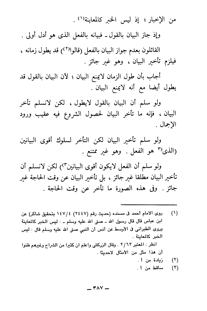 وَلَوْ سُلِّمَ أَنَّ الْبَيَانَ بِالْقَوْلِ لَا يَطُولُ، لَكِنْ لَا نُسَلِّمُ تَأَخُّرَ الْبَيَانِ، فَإِنَّهُ مَا تَأَخَّرَ الْبَيَانُ لِحُصُولِ الشُّرُوعِ فِيهِ عُقَيْبَ وُرُودِ الْإِجْمَالِ.