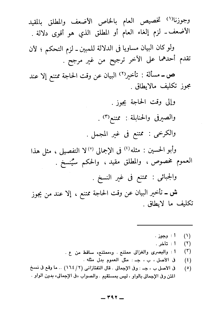 ش - تَأْخِيرُ الْبَيَانِ عَنْ وَقْتِ الْحَاجَةِ مُمْتَنِعٌ، إِلَّا عِنْدَ مَنْ يُجَوِّزُ تَكْلِيفَ مَا لَا يُطَاقُ.