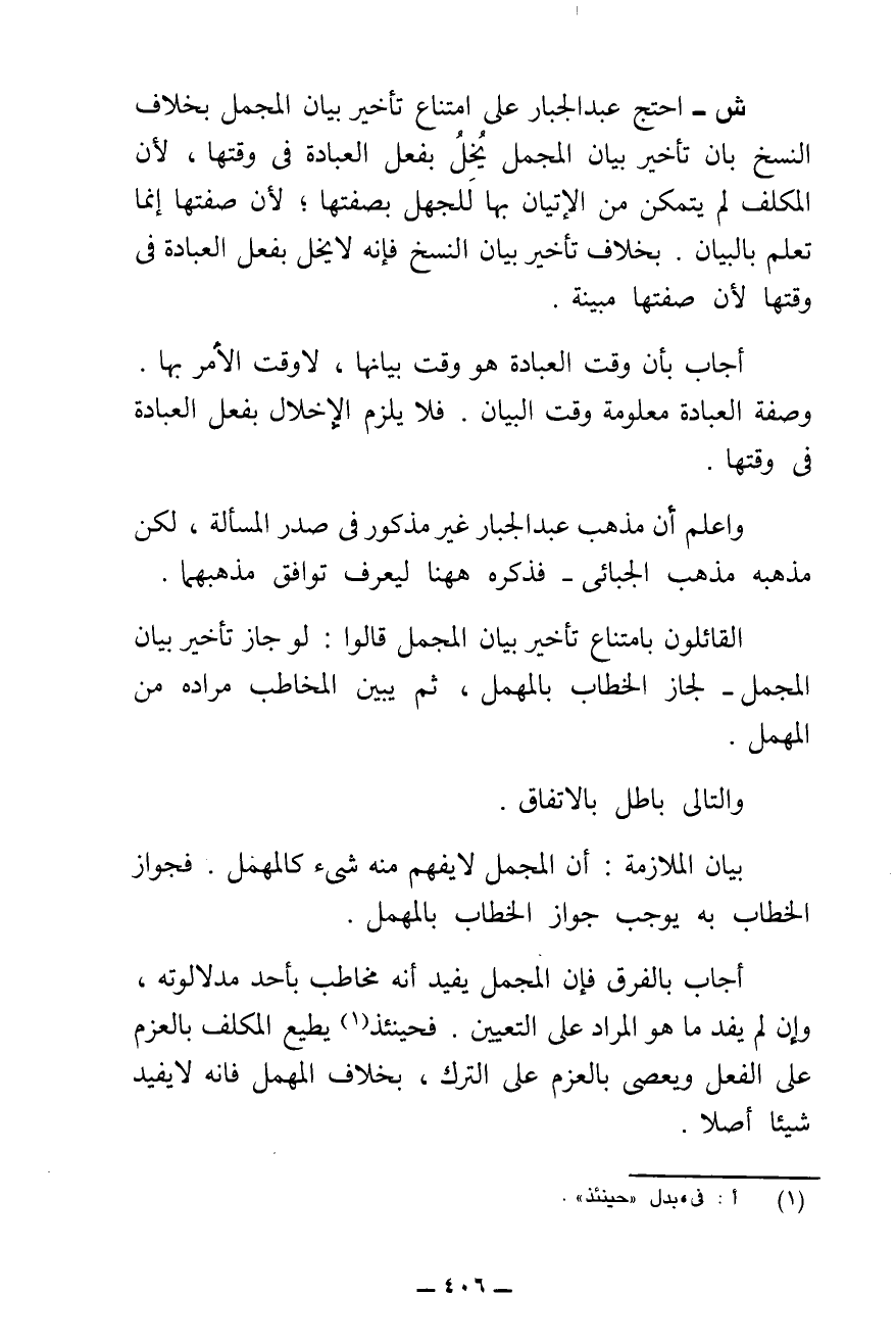 ش - احْتَجَّ عَبْدُ الْجَبَّارِ عَلَى امْتِنَاعِ تَأْخِيرِ بَيَانِ الْمُجْمَلِ بِخِلَافِ النَّسْخِ بِأَنَّ تَأْخِيرَ بَيَانِ الْمُجْمَلِ يُخِلُّ بِفِعْلِ الْعِبَادَةِ فِي وَقْتِهَا؛ لِأَنَّ الْمُكَلَّفَ لَمْ يَتَمَكَّنْ مِنَ الْإِتْيَانِ بِهَا لِلْجَهْلِ بِصِفَتِهَا، لِأَنَّ صِفَتَهَا إِنَّمَا تُعْلَمُ بِالْبَيَانِ، بِخِلَافِ تَأْخِيرِ بَيَانِ النَّسْخِ فَإِنَّهُ لَا يُخِلُّ بِفِعْلِ الْعِبَادَةِ فِي وَقْتِهَا لِأَنَّ صِفَتَهَا مُبَيَّنَةٌ.