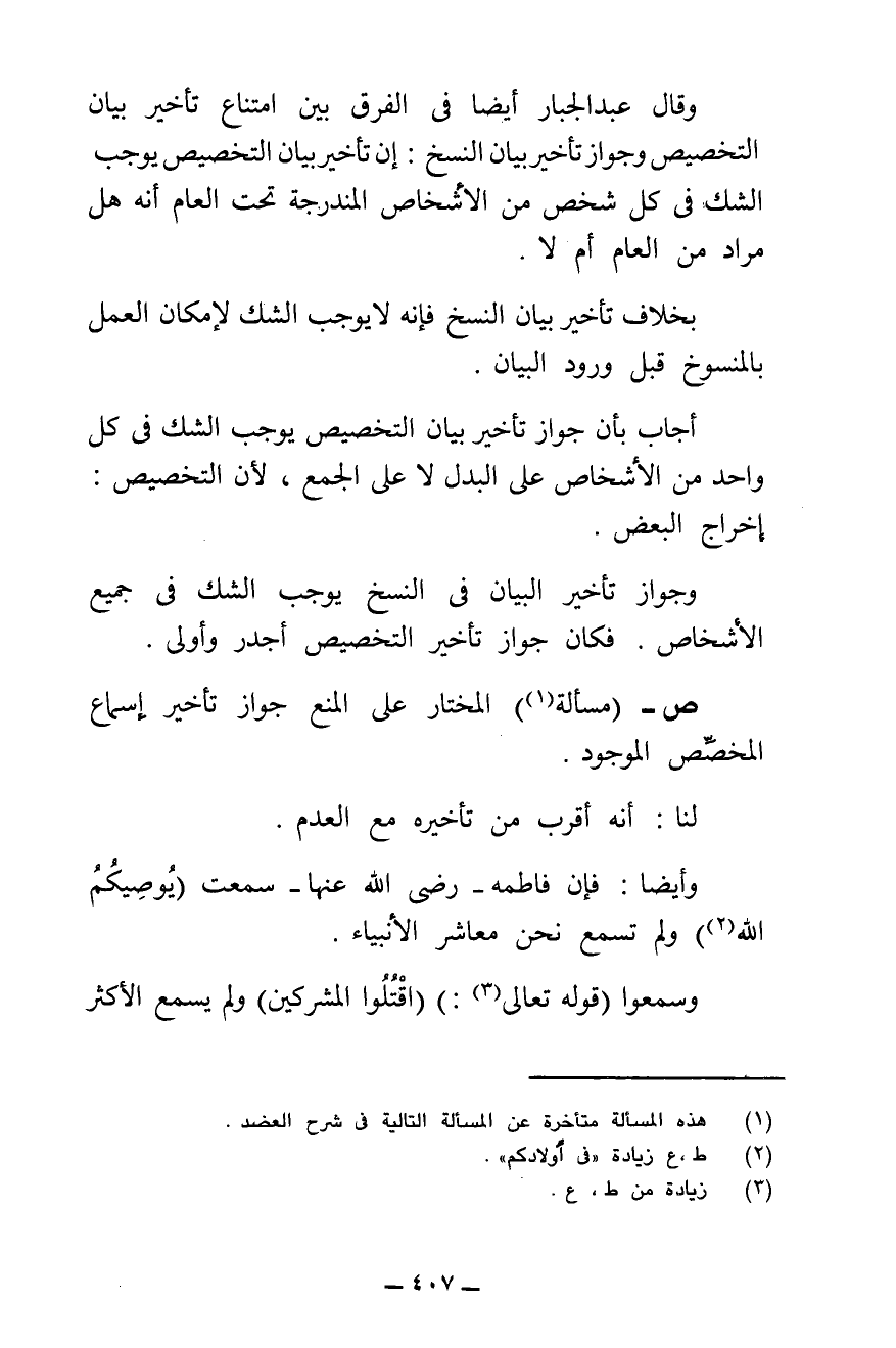 وَقَالَ عَبْدُ الْجَبَّارِ أَيْضًا فِي الْفَرْقِ بَيْنَ امْتِنَاعِ تَأْخِيرِ بَيَانِ التَّخْصِيصِ وَجَوَازِ تَأْخِيرِ بَيَانِ النَّسْخِ: إِنَّ تَأْخِيرَ بَيَانِ التَّخْصِيصِ يُوجِبُ الشَّكَّ فِي كُلِّ شَخْصٍ مِنَ الْأَشْخَاصِ الْمُنْدَرِجَةِ تَحْتَ الْعَامِّ أَنَّهُ هَلْ مُرَادٌ مِنَ الْعَامِّ أَمْ لَا؟ .