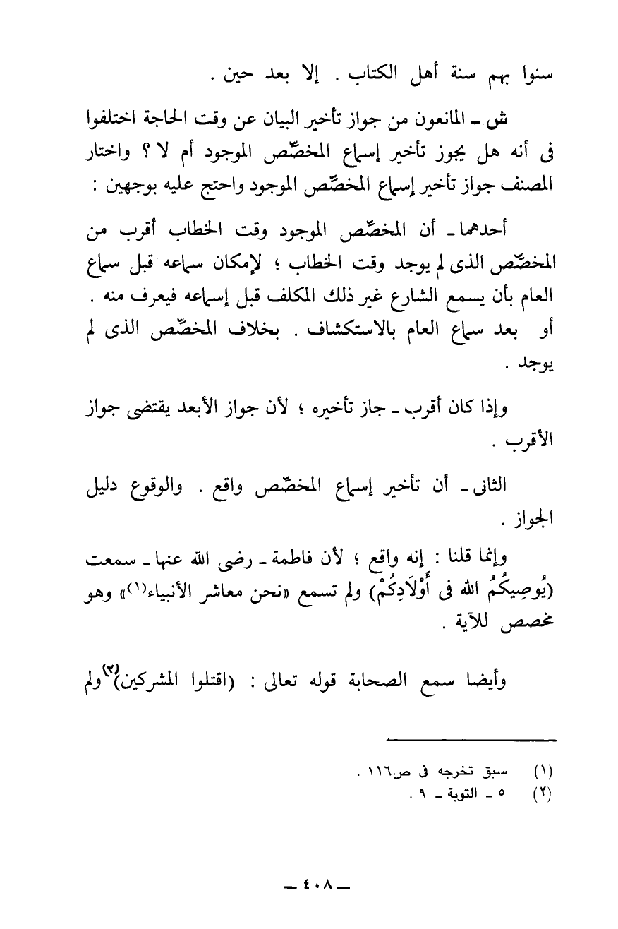 ص - (مَسْأَلَةٌ) الْمُخْتَارُ عَلَى الْمَنْعِ، جَوَازُ تَأْخِيرِهِ - عَلَيْهِ السَّلَامُ - تَبْلِيغَ الْحُكْمِ إِلَى وَقْتِ الْحَاجَةِ، لِلْقَطْعِ بِأَنَّهُ لَا يَلْزَمُ مِنْهُ مُحَالٌ. وَلَعَلَّ فِيهِ مَصْلَحَةً.