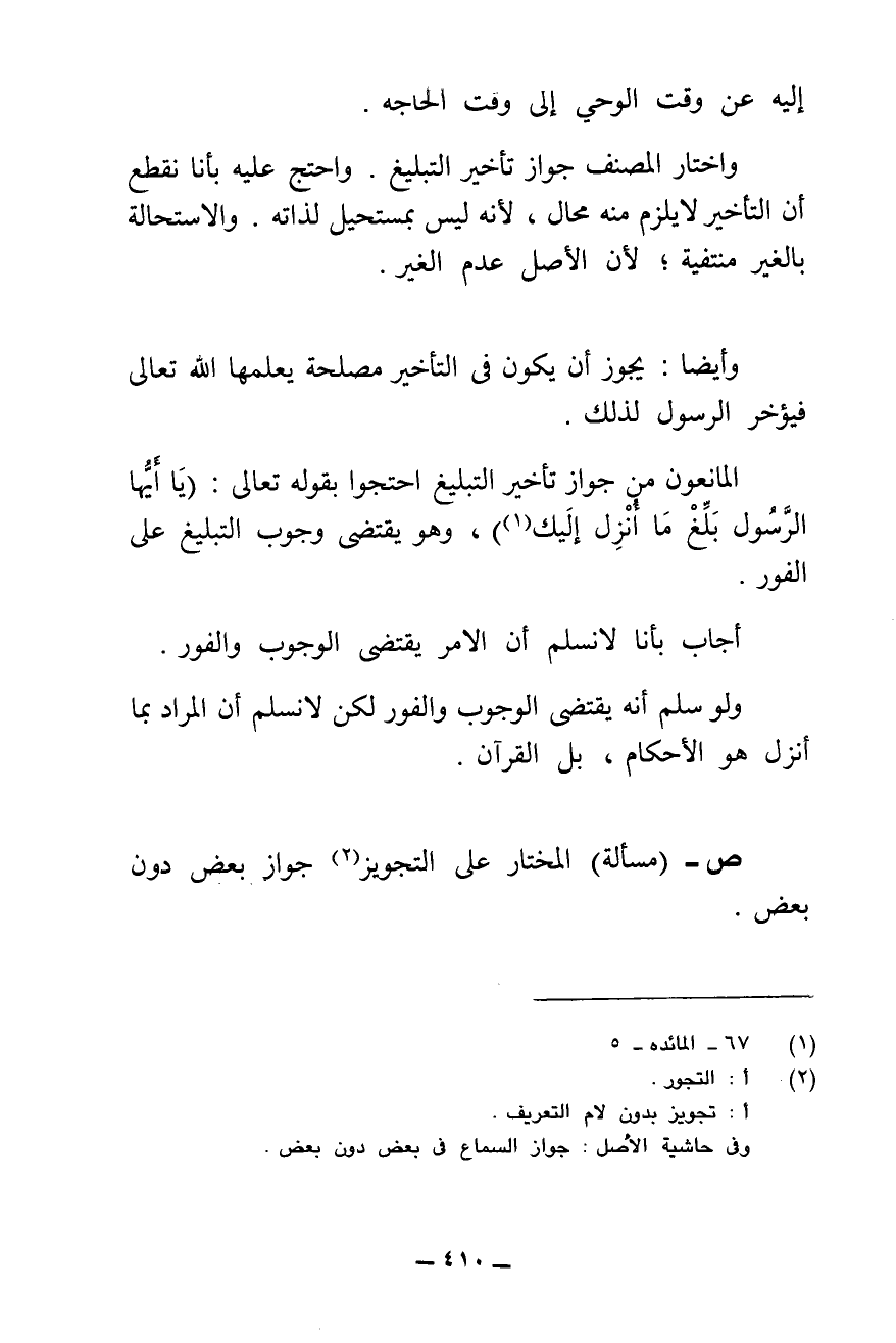 الْمَانِعُونَ مِنْ جَوَازِ تَأْخِيرِ التَّبْلِيغِ احْتَجُّوا بِقَوْلِهِ تَعَالَى: {يَاأَيُّهَا الرَّسُولُ بَلِّغْ مَا أُنْزِلَ إِلَيْكَ} [المائدة: ٦٧] ، وَهُوَ يَقْتَضِي وُجُوبَ التَّبْلِيغِ عَلَى الْفَوْرِ.