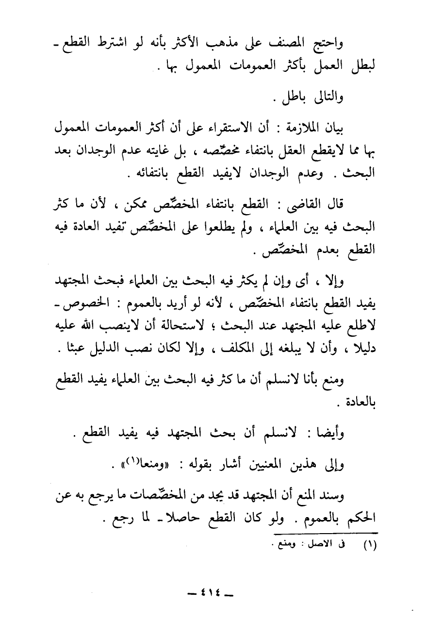 وَاحْتَجَّ الْمُصَنِّفُ عَلَى مَذْهَبِ الْأَكْثَرِ بِأَنَّهُ لَوِ اشْتُرِطَ الْقَطْعُ لَبَطَلَ الْعَمَلُ بِأَكْثَرِ الْعُمُومَاتِ الْمَعْمُولِ بِهَا.