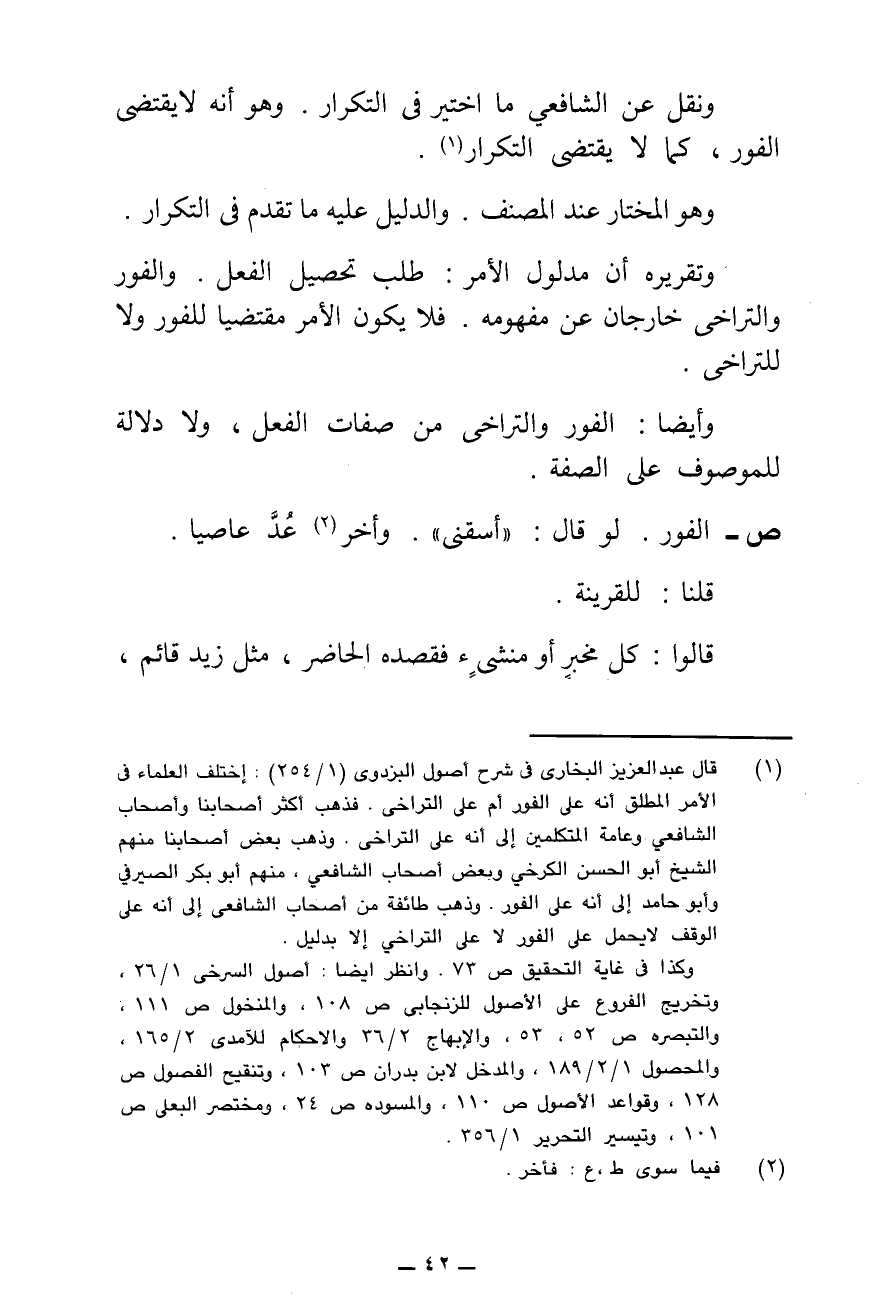 وَتَقْرِيرُهُ أَنَّ مَدْلُولَ الْأَمْرِ: طَلَبُ تَحْصِيلِ الْفِعْلِ، وَالْفَوْرُ وَالتَّرَاخِي خَارِجَانِ عَنْ مَفْهُومِهِ. فَلَا يَكُونُ الْأَمْرُ مُقْتَضِيًا لِلْفَوْرِ وَلَا لِلتَّرَاخِي.