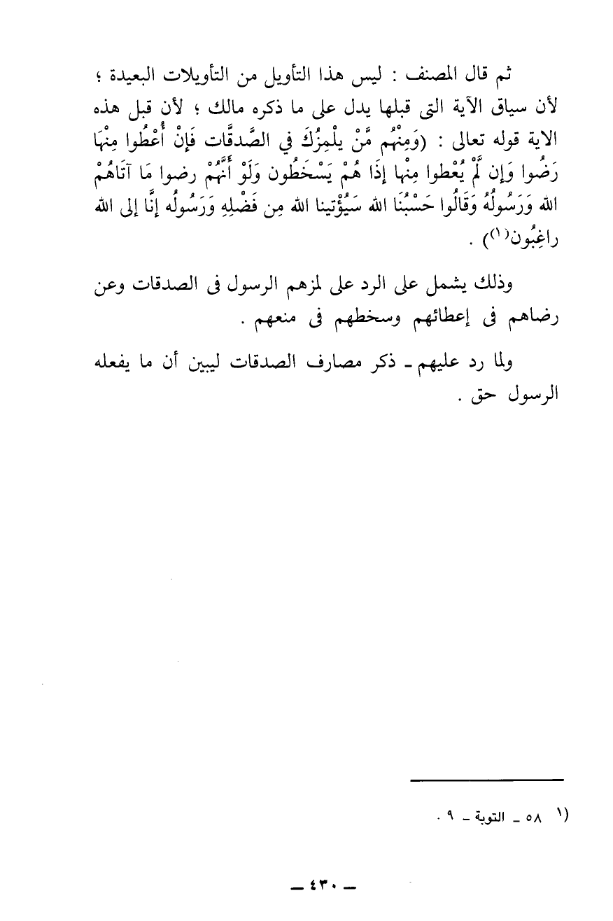 ثُمَّ قَالَ الْمُصَنِّفُ: لَيْسَ هَذَا التَّأْوِيلُ مِنَ التَّأْوِيلَاتِ الْبَعِيدَةِ ; لِأَنَّ سِيَاقَ الْآيَةِ الَّتِي قَبْلَهَا يَدُلُّ عَلَى مَا ذَكَرَهُ مَالِكٌ ; لِأَنَّ قَبْلَ هَذِهِ الْآيَةِ قَوْلَهُ تَعَالَى: {وَمِنْهُمْ مَنْ يَلْمِزُكَ فِي الصَّدَقَاتِ فَإِنْ أُعْطُوا مِنْهَا رَضُوا وَإِنْ لَمْ يُعْطَوْا مِنْهَا إِذَا هُمْ يَسْخَطُونَ وَلَوْ أَنَّهُمْ رَضُوا مَا آتَاهُمُ اللَّهُ وَرَسُولُهُ وَقَالُوا حَسْبُنَا اللَّهُ سَيُؤْتِينَا اللَّهُ مِنْ فَضْلِهِ وَرَسُولُهُ إِنَّا إِلَى اللَّهِ رَاغِبُونَ} [التوبة: ٥٨] .