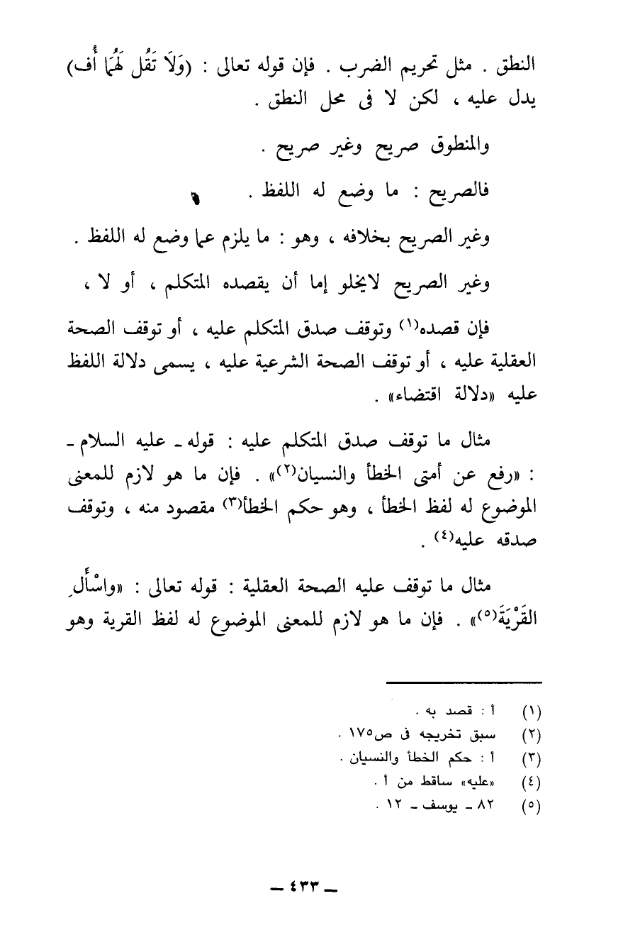النُّطْقِ. مِثْلُ تَحْرِيمِ الضَّرْبِ؛ فَإِنَّ قَوْلَهُ تَعَالَى: {فَلَا تَقُلْ لَهُمَا أُفٍّ} [الإسراء: ٢٣] يَدُلُّ عَلَيْهِ، لَكِنْ لَا فِي مَحَلِّ النُّطْقِ.