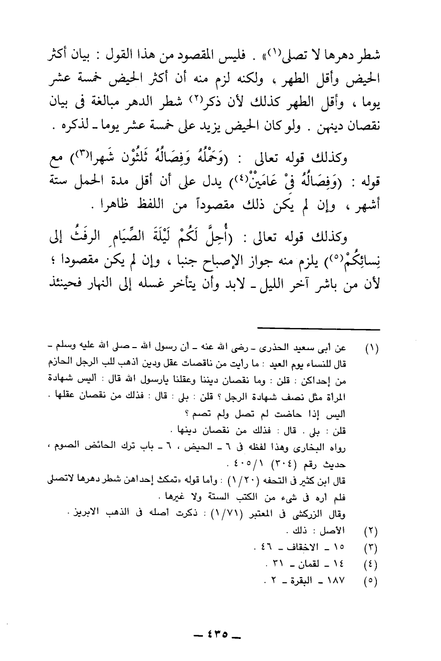 شَطْرَ دَهْرِهَا لَا تُصَلِّي» "، فَلَيْسَ الْمَقْصُودُ مِنْ هَذَا الْقَوْلِ: بَيَانَ أَكْثَرِ الْحَيْضِ وَأَقَلِّ الطُّهْرِ، وَلَكِنَّهُ لَزِمَ مِنْهُ أَنَّ أَكْثَرَ الْحَيْضِ خَمْسَةَ عَشَرَ يَوْمًا، وَأَقَلَّ الطُّهْرِ كَذَلِكَ لِأَنَّ ذِكْرَ شَطْرِ الدَّهْرِ مُبَالَغَةٌ فِي بَيَانِ نُقْصَانِ دِينِهِنَّ، وَلَوْ كَانَ الْحَيْضُ يَزِيدُ عَلَى خَمْسَةَ عَشَرَ يَوْمًا لَذَكَرَهُ. وَكَذَلِكَ قَوْلُهُ تَعَالَى: ( «وَحَمْلُهُ وَفِصَالُهُ ثَلَاثُونَ شَهْرًا» ) مَعَ قَوْلِهِ: {وَفِصَالُهُ فِي عَامَيْنِ} [لقمان: ١٤] يَدُلُّ عَلَى أَنَّ أَقَلَّ مُدَّةِ الْحَمْلِ سِتَّةُ أَشْهُرٍ، وَإِنْ لَمْ يَكُنْ ذَلِكَ مَقْصُودًا مِنَ اللَّفْظِ ظَاهِرًا.