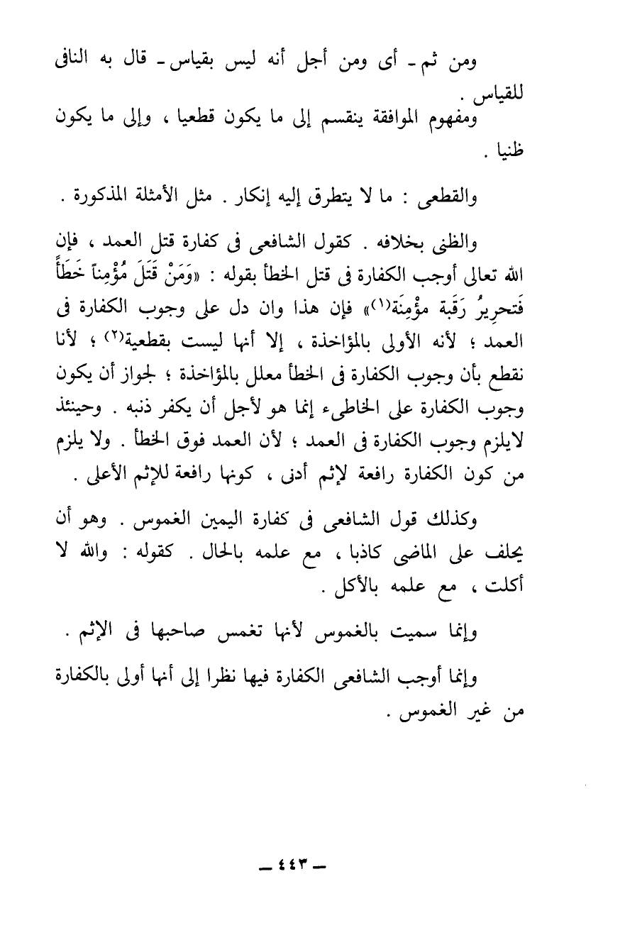 وَالْقَطْعِيُّ: مَا لَا يَتَطَرَّقُ إِلَيْهِ إِنْكَارٌ؛ مِثْلُ الْأَمْثِلَةِ الْمَذْكُورَةِ، وَالظَّنِّيُّ بِخِلَافِهِ؛ كَقَوْلِ الشَّافِعِيِّ فِي كَفَّارَةِ قَتْلِ الْعَمْدِ: فَإِنَّ اللَّهَ تَعَالَى أَوْجَبَ الْكَفَّارَةَ فِي قَتْلِ الْخَطَأِ بِقَوْلِهِ: " وَمَنْ قَتَلَ مُؤْمِنًا خَطَأً فَتَحْرِيرُ رَقَبَةٍ مُؤْمِنَةٍ " فَإِنَّ هَذَا وَإِنْ دَلَّ عَلَى وُجُوبِ الْكَفَّارَةَ فِي الْعَمْدِ ; لِأَنَّهُ الْأَوْلَى بِالْمُؤَاخَذَةِ، إِلَّا أَنَّهَا لَيْسَتْ بِقَطْعِيَّةٍ ; لِأَنَّا نَقْطَعُ بِأَنَّ وُجُوبَ الْكَفَّارَةِ فِي الْخَطَأِ مُعَلَّلٌ بِالْمُؤَاخَذَةِ ; لِجَوَازِ أَنْ يَكُونَ وُجُوبُ الْكَفَّارَةِ عَلَى الْخَاطِئِ إِنَّمَا هُوَ لِأَجْلِ أَنْ يُكَفِّرَ ذَنْبَهُ، وَحِينَئِذٍ لَا يَلْزَمُ وُجُوبُ الْكَفَّارَةِ فِي الْعَمْدِ ; لِأَنَّ الْعَمْدَ فَوْقَ الْخَطَأِ، وَلَا يَلْزَمُ مِنْ كَوْنِ الْكَفَّارَةِ رَافِعَةً لِإِثْمٍ أَدَقَّ كَوْنُهَا رَافِعَةً لِلْإِثْمِ الْأَعْلَى.