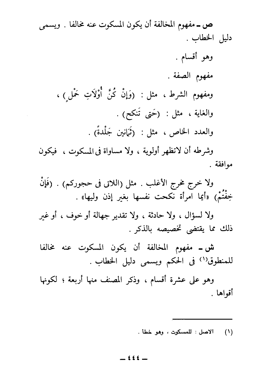 ش - مَفْهُومُ الْمُخَالَفَةِ أَنْ يَكُونَ الْمَسْكُوتُ عَنْهُ مُخَالِفًا لِلْمَنْطُوقِ فِي الْحُكْمِ وَيُسَمَّى دَلِيلَ الْخِطَابِ.