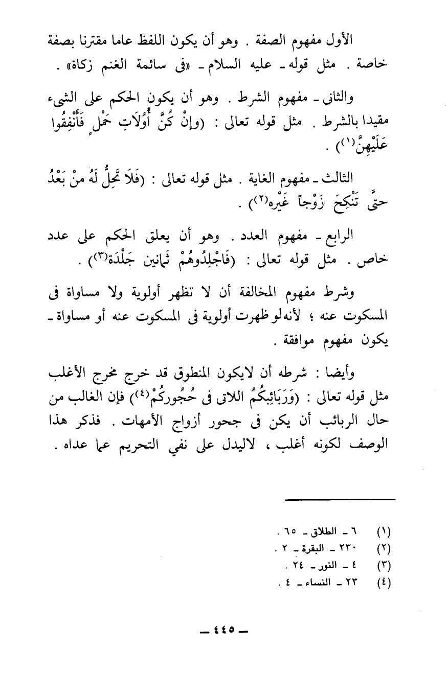 الْأَوَّلُ مَفْهُومُ الصِّفَةِ؛ وَهُوَ أَنْ يَكُونَ اللَّفْظُ عَامًّا مُقْتَرِنًا بِصِفَةٍ خَاصَّةٍ، مِثْلُ قَوْلِهِ - عَلَيْهِ السَّلَامُ - " فِي سَائِمَةِ الْغَنَمِ زَكَاةٌ ".