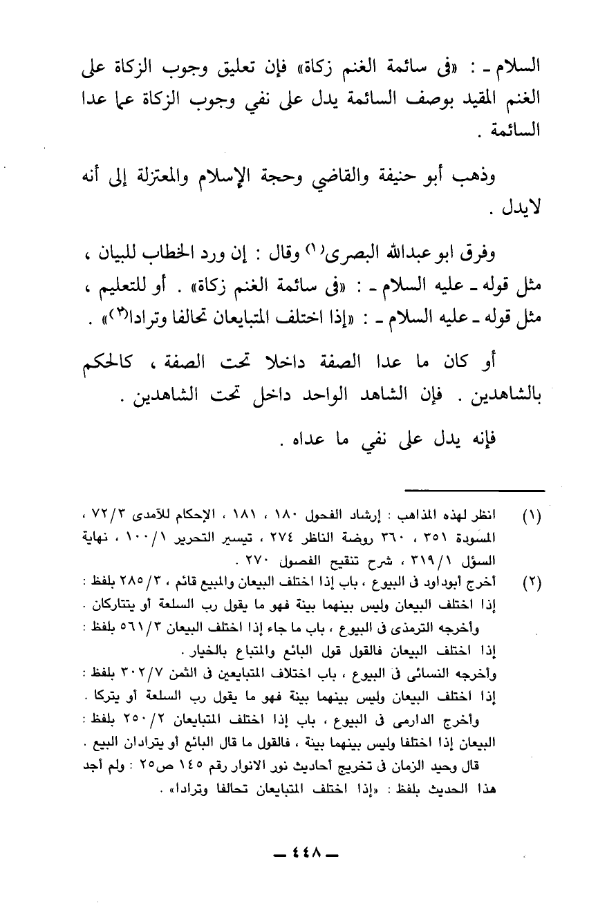 وَفَرَّقَ أَبُو عَبْدِ اللَّهِ الْبَصْرِيُّ وَقَالَ: إِنْ وَرَدَ الْخِطَابُ لِلْبَيَانِ؛ مِثْلُ قَوْلِهِ - عَلَيْهِ السَّلَامُ -: " «فِي سَائِمَةِ الْغَنَمِ زَكَاةٌ» "، أَوْ لِلتَّعْلِيمِ؛ مِثْلُ قَوْلِهِ - عَلَيْهِ السَّلَامُ -: " «إِذَا اخْتَلَفَ الْمُتَبَايِعَانِ تَحَالَفَا وَتَرَادَّا» ) "، أَوْ كَانَ مَا عَدَا الصِّفَةَ دَاخِلًا تَحْتَ الصِّفَةِ، كَالْحُكْمِ بِالشَّاهِدَيْنِ - فَإِنَّ الشَّاهِدَ الْوَاحِدَ دَاخِلٌ تَحْتِ الشَّاهِدَيْنِ؛ فَإِنَّهُ يَدُلُّ عَلَى نَفْيِ مَا عَدَاهُ.